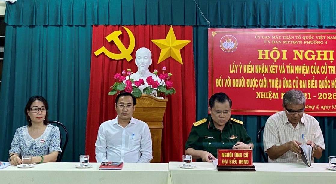Tại hội nghị, Ủy ban MTTQ Việt Nam phường 4 đã thông tin đến các cử tri về tiểu sử, quá trình công tác của Đại tá Nguyễn Tâm Hùng, Chỉ huy trưởng Bộ CHQS tỉnh, người được giới thiệu ứng cử ĐBQH khóa XV và 3 đồng chí được giới thiệu ứng cử đại biểu HĐND tỉnh Bà Rịa - Vũng Tàu nhiệm kỳ 2021-2026.