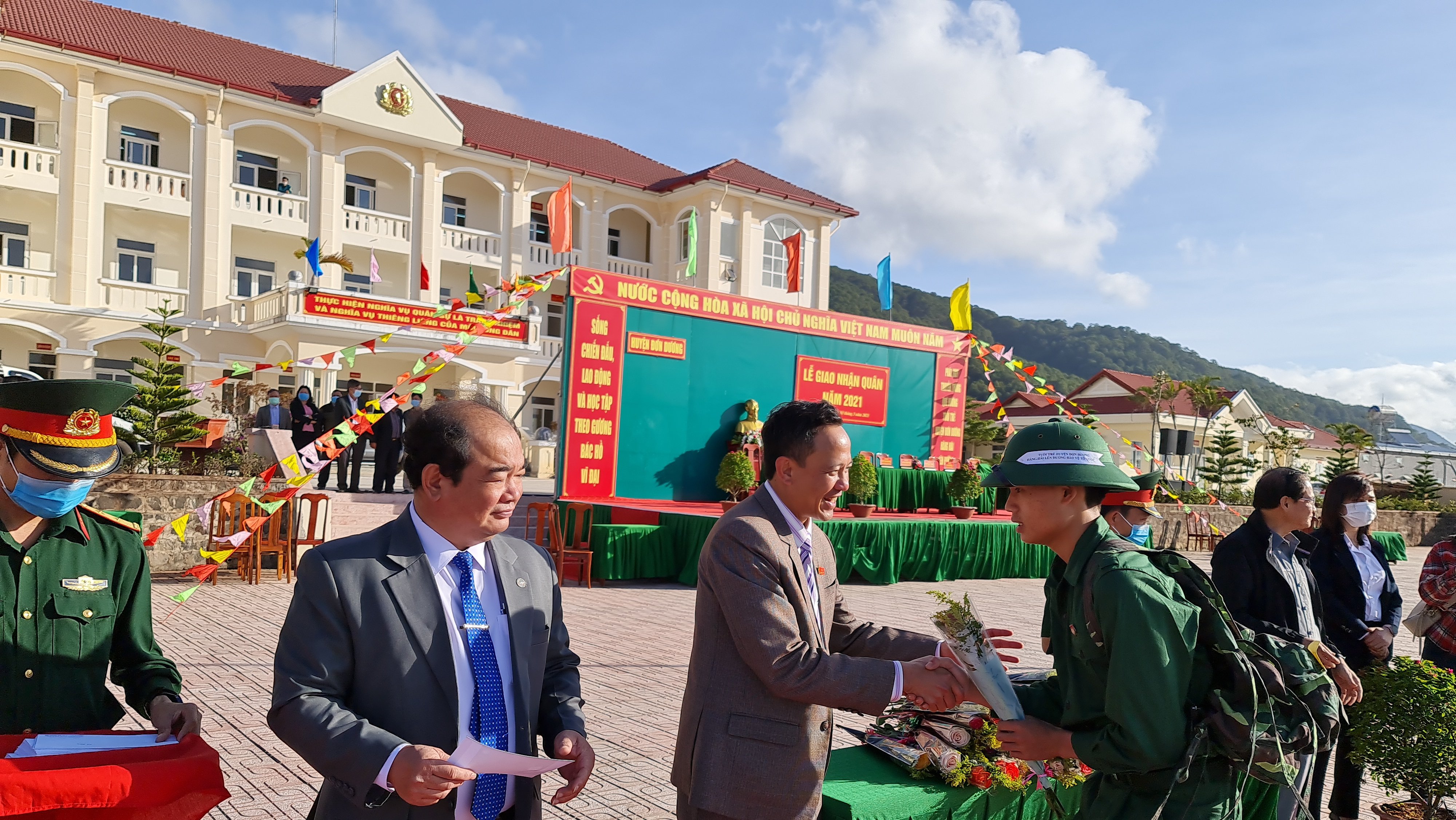 Lãnh đạo huyện Đơn Dương tặng hoa và quà động viên thanh niên lên đường nhập ngũ.