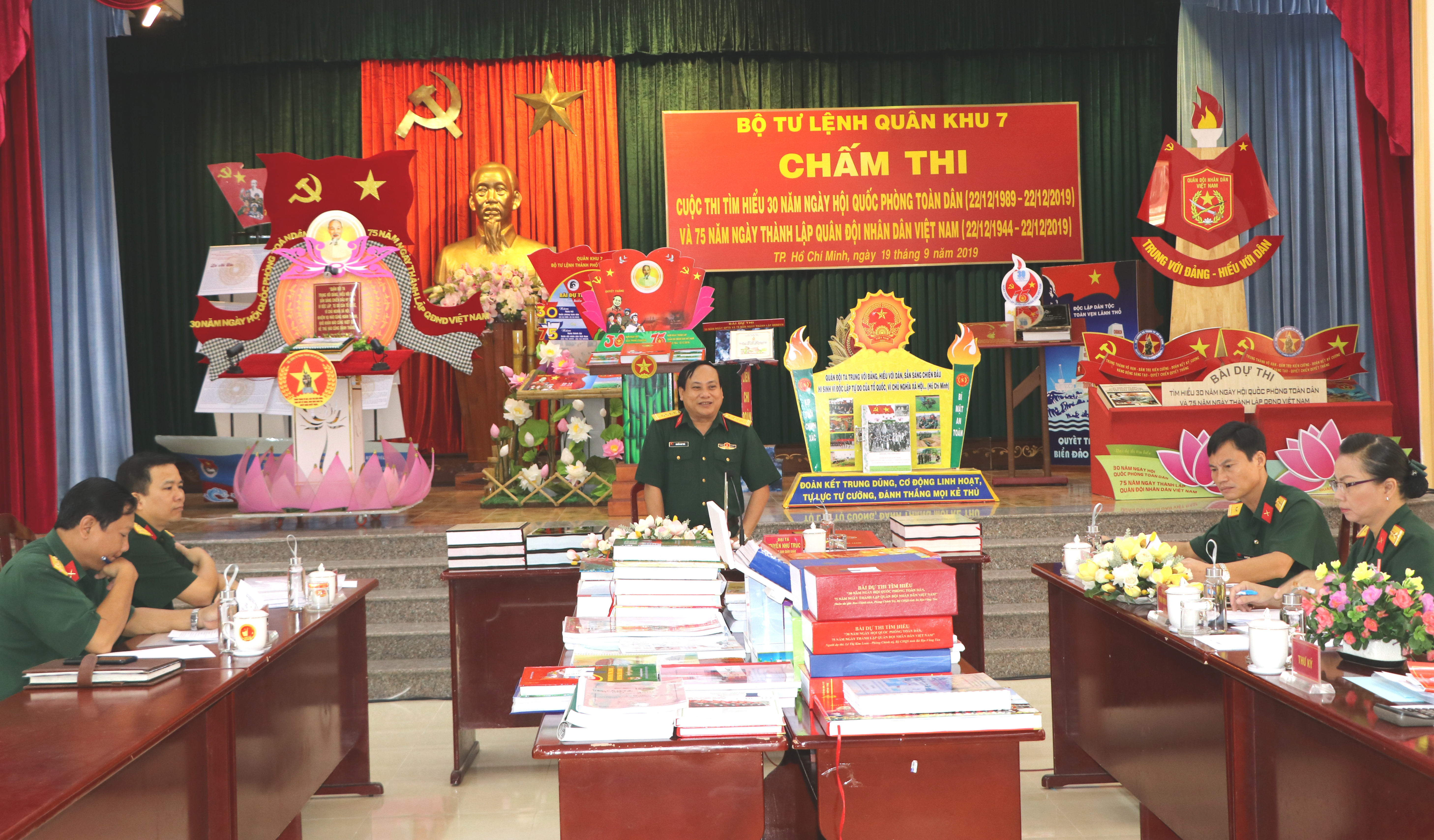 (QK7 Online) - Ngày 19/9, Đại tá Nguyễn Như Trúc, Phó Chủ nhiệm Chính trị Quân khu cùng các thành viên trong Ban giám khảo cuộc thi tìm hiểu 30 năm Ngày hội Quốc phòng toàn dân và 75 năm Ngày thành lập Quân đội nhân dân Việt Nam đã tổ chức vòng chấm chung khảo, chọn ra các bài thi tiêu biểu nhất để trao giải trong thời gian tới.