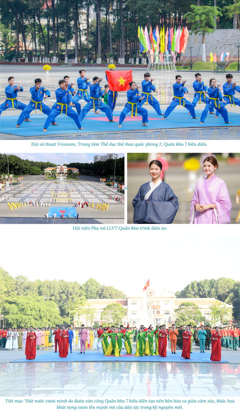(QK7 Online) - Ngày 30/3, tại Thành phố Hồ Chí Minh, Bộ Tư lệnh Quân khu 7 tổ chức Chương trình “Đồng diễn nghệ thuật” với chủ đề “Vững bước dưới cờ Đảng quang vinh” với sự tham gia của gần 3.000 cán bộ, chiến sĩ, đoàn viên, thanh niên, hội viên phụ nữ cơ sở đến từ 27 cơ quan, đơn vị trong LLVT Quân khu và các đơn vị kết nghĩa trên địa bàn.