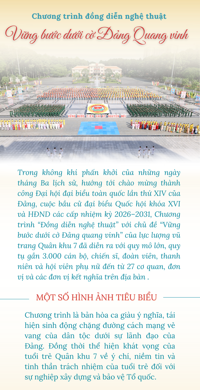 Gần 3.000 cán bộ, chiến sĩ LLVT Quân khu 7 tham gia đồng diễn nghệ thuật “Vững bước dưới cờ Đảng quang vinh”