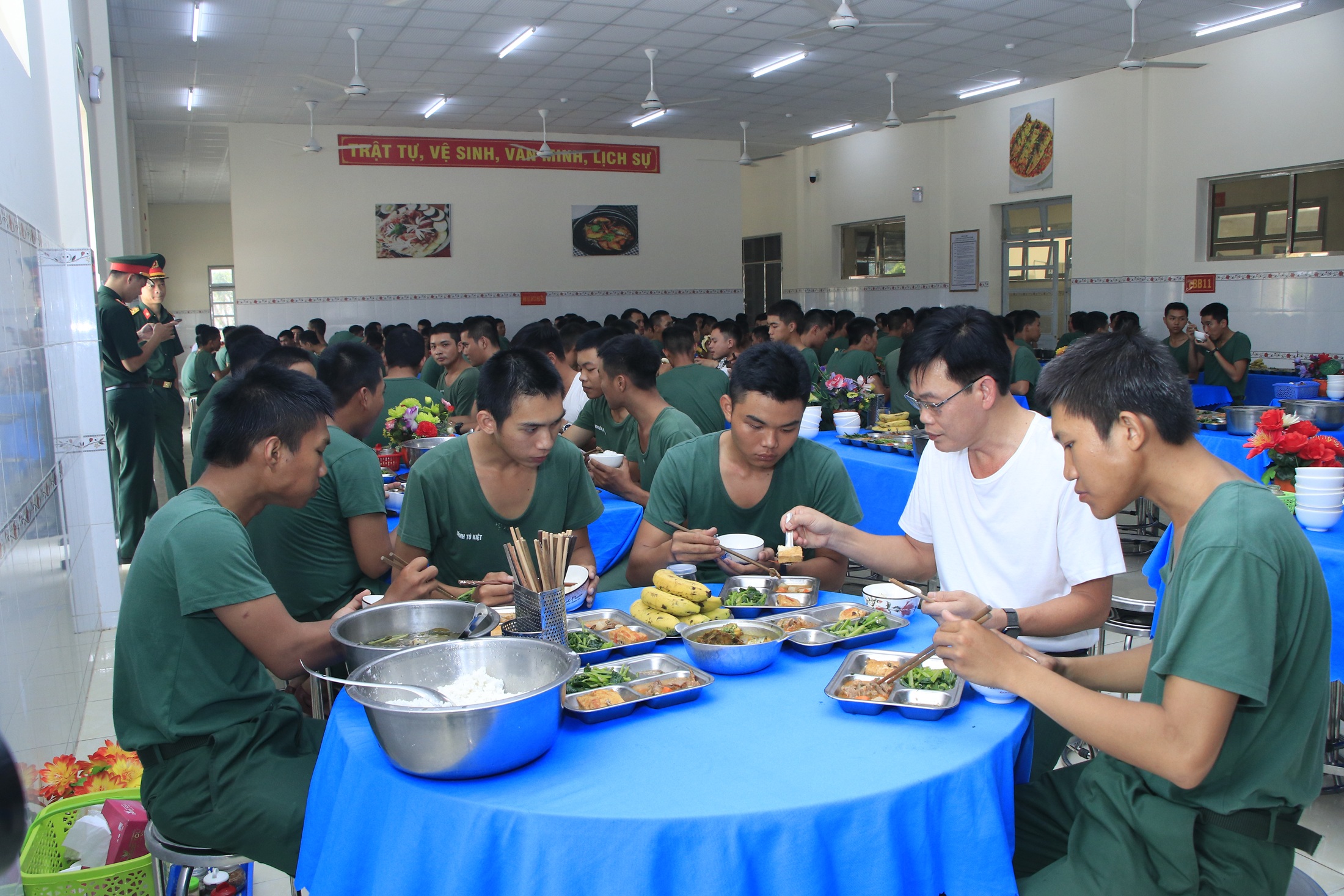 Đại tá Trần Hoàng Giang (áo trắng), Chính ủy Sư đoàn 5 ăn cơm cùng các chiến sĩ mới tại bếp ăn Tiểu đoàn 3, Trung đoàn 4, Sư đoàn 5.