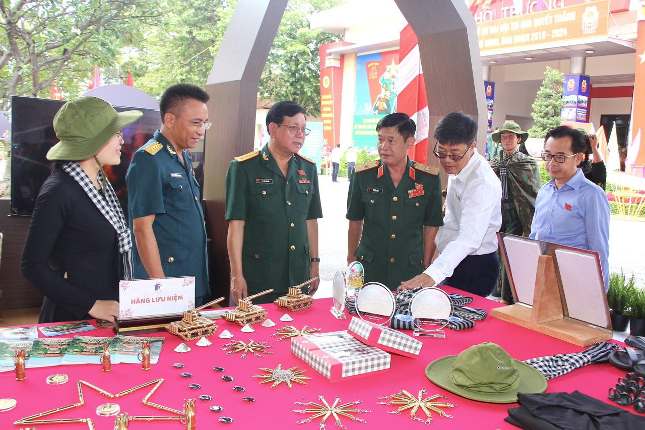 Đại tá Lê Văn Phước - Giám đốc Khu Di tích lịch sử Địa đạo Củ Chi (thứ 3 bên trái) giới thiệu sản phẩm trưng bày tại Đại hội Thi đua Quyết thắng, giai đoạn 2019 - 2024 của địa đạo.
