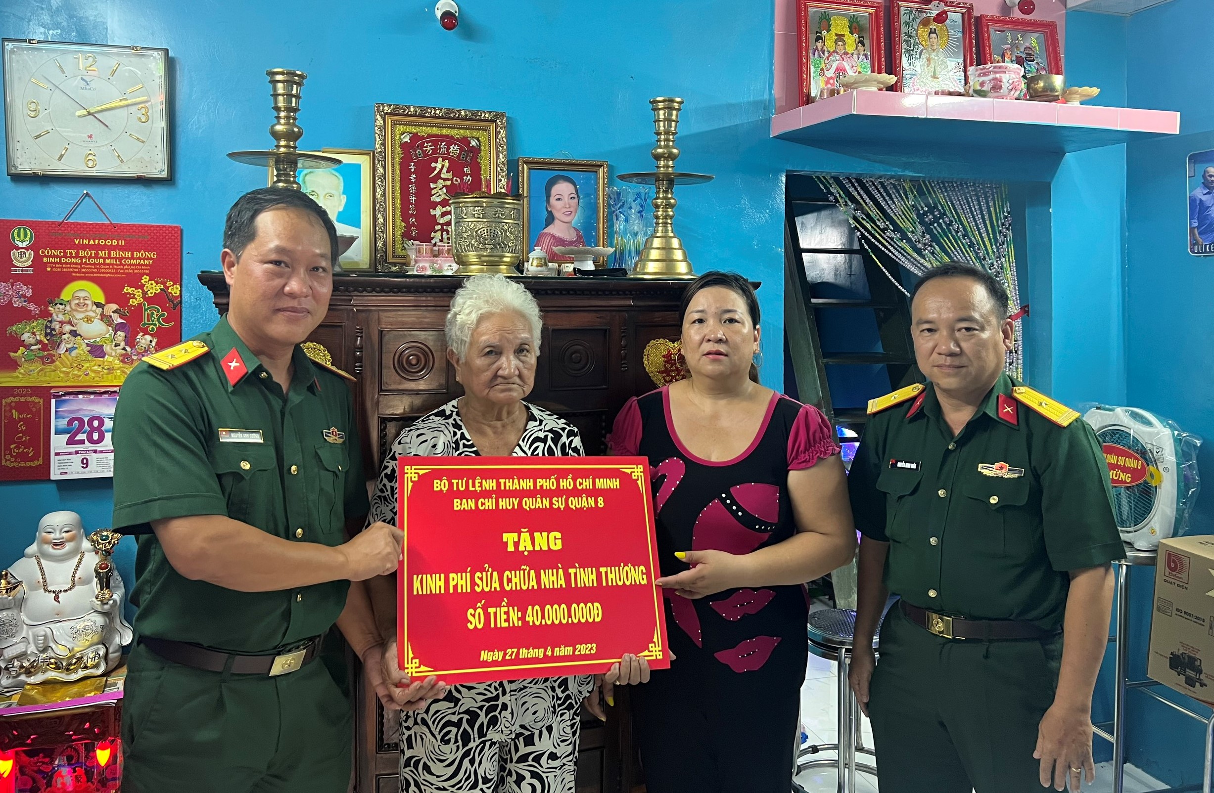 Đại diện Ban CHQS Quận 8 trao kinh phí sửa chữa nhà cho gia đình.