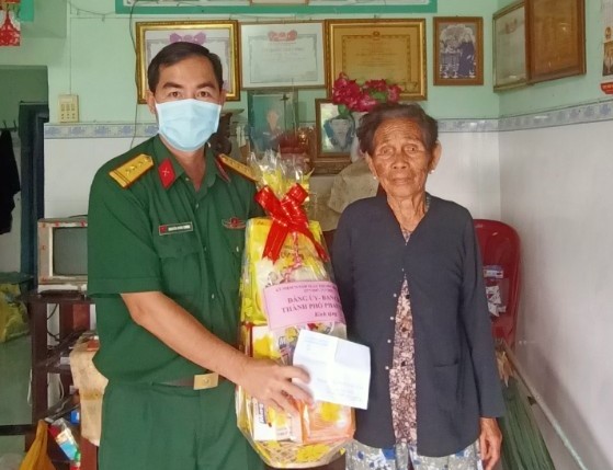 Thượng tá Nguyễn Minh Chính, Chính trị viên Ban CHQS thành phố Phan Thiết ân cần thăm hỏi, chúc sức khỏe Mẹ Việt Nam Anh hùng Huỳnh Thị Sáu và 7 gia đình chính sách, bày tỏ sự tri ân với những đóng góp to lớn của Mẹ và các gia đình tới sự nghiệp đấu tranh giải phóng dân tộc, xây dựng và bảo vệ Tổ quốc.