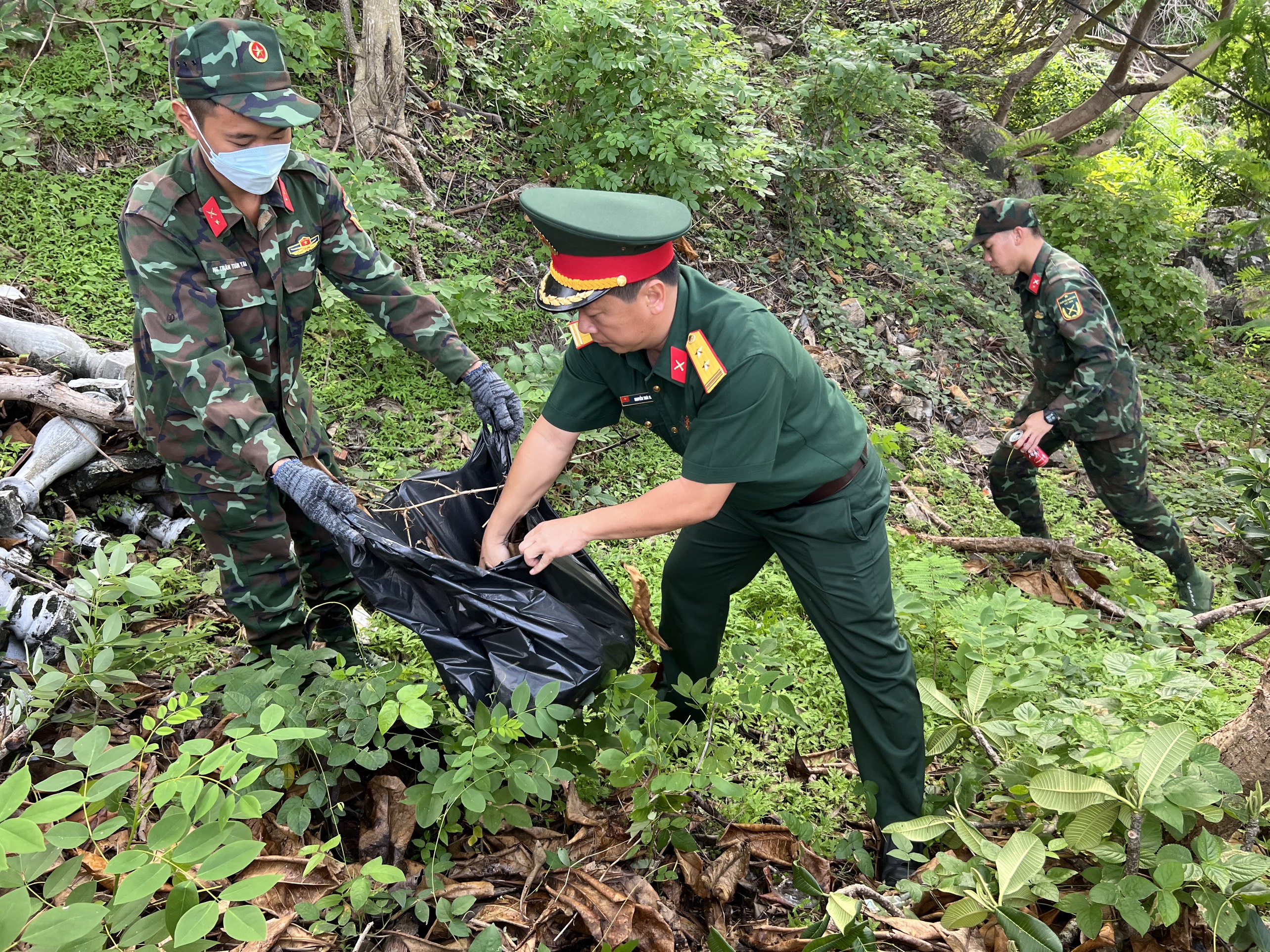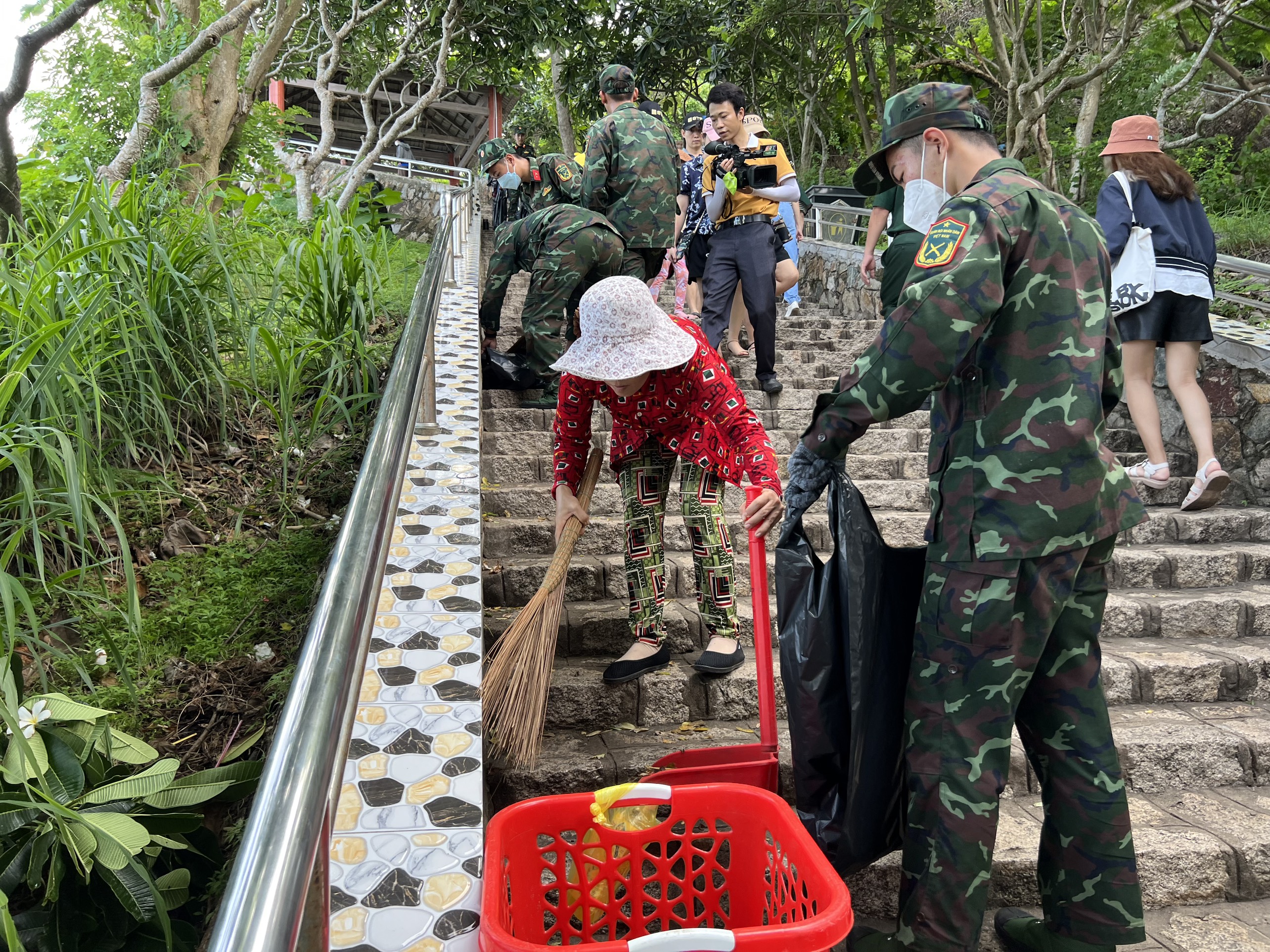 Cán bộ, chiến sĩ LLVT thành phố Vũng Tàu phối hợp dọn vệ sinh làm đẹp môi trường.