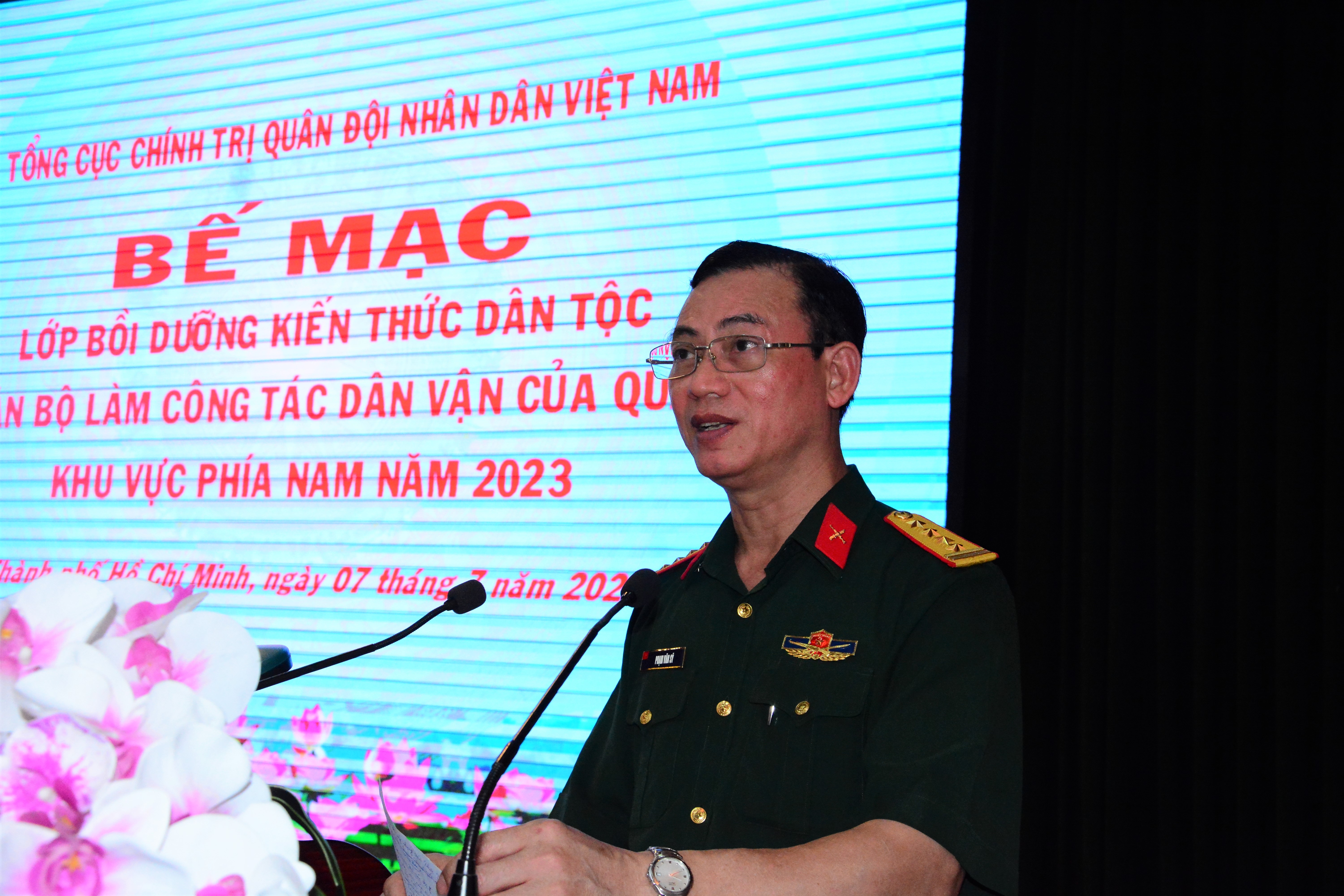 (QK7 Online) - Ngày 7/7/2023, tại Trường Quân sự Quân khu 7, Cục Dân vận (Tổng cục Chính trị Quân đội Nhân dân Việt Nam) tổ chức bế mạc Lớp bồi dưỡng kiến thức dân tộc cho cán bộ làm công tác dân vận của Quân đội khu vực phía Nam năm 2023.