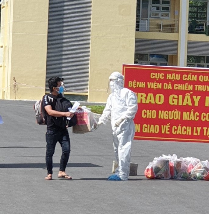 Đại tá, bác sĩ Lê Quang Trí, Giám đốc Bệnh viện Quân y 7A và Đại tá, bác sĩ Trần Hồng Tâm, Giám đốc Bệnh viện dã chiến truyền nhiễm số 5B trao giấy ra viện, quà và động viên người dân về địa phương theo dõi sức khỏe và tiếp tục cách ly tại nhà thêm 14 ngày theo quy định của Bộ Y tế, đồng thời thực hiện khuyến cáo “5K+vaccine” trong phòng, chống Covid - 19.