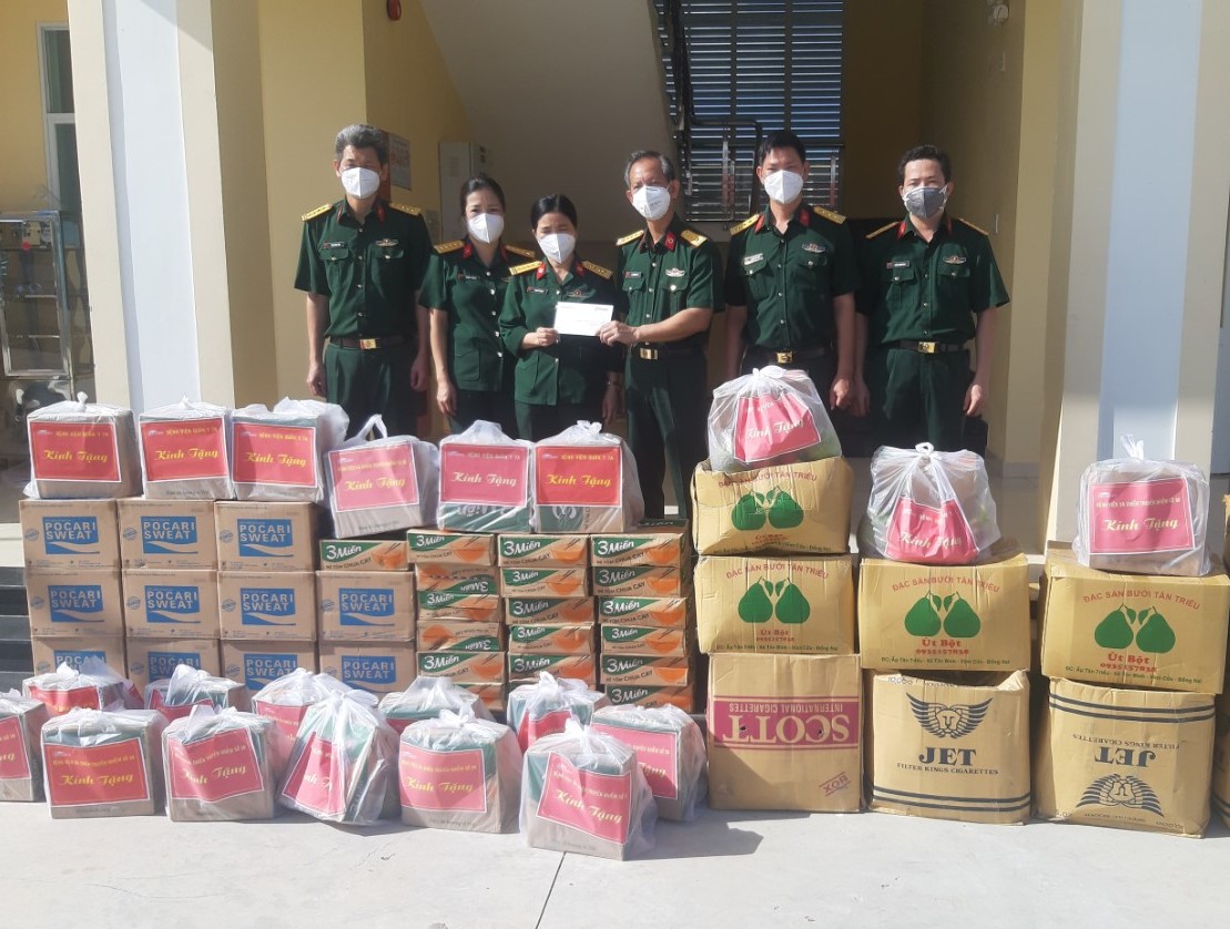 Đại tá, bác sĩ Lê Quang Trí, Giám đốc Bệnh viện Quân y 7A tặng quà cán bộ, y, bác sĩ Bệnh viện dã chiến truyền nhiễm số 5B.