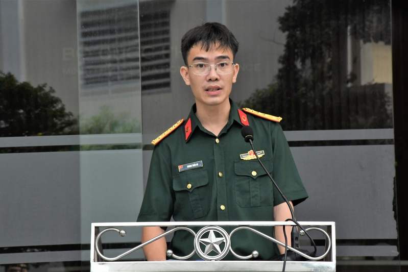 Đại uý Hoàng Trần Bá, bác sĩ điều trị Khoa Bỏng - Tạo hình, đại diện đoàn công tác chia sẻ quyết tâm trước khi lên đường thực hiện nhiệm vụ.