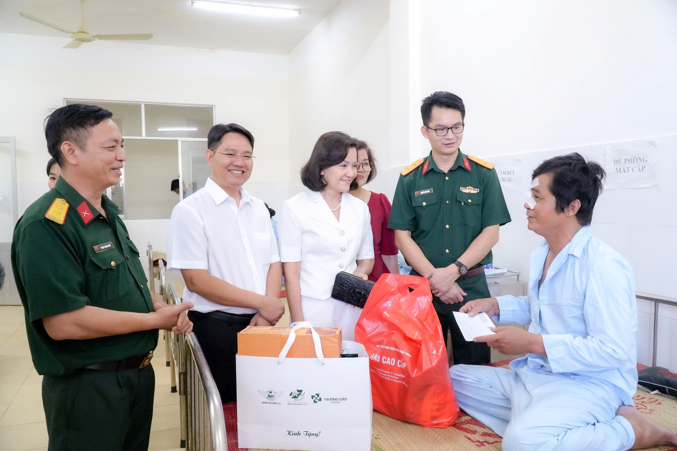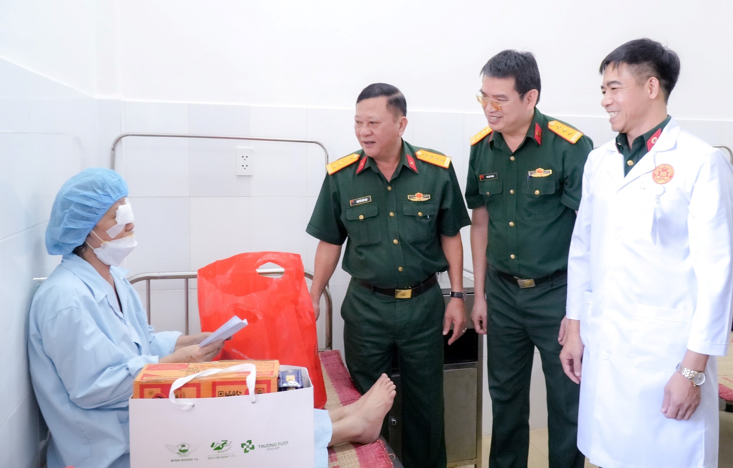 Thượng tá, Tiến sĩ Bùi Đức Thành, Phó Giám đốc Bệnh viện Quân y 175 (giữa) và lãnh đạo Binh đoàn 16 thăm hỏi, động viên người bệnh sau khi được phẫu thuật.