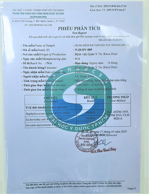 Đại tá, Tiến sĩ, Bác sĩ CKII Lê Quang Trí - Giám đốc Bệnh viện Quân y 7A cho biết: sản phẩm này đã được gởi qua Trung tâm Công nghệ Dược Sài Gòn, Trường đại học Y Dược thành phố Hồ Chí Minh để kiểm nghiệm cho kết quả đạt tỷ lệ kháng khuẩn gần 100%, rất tốt so với các loại nước rửa tay nhanh hiện nay. Trong thời gian tới, Bệnh viện Quân y 7A báo cáo với Cục Hậu cần Quân khu đảm bảo sản xuất nước rửa tay, kịp thời cung ứng cho tất cả các cơ quan, đơn vị trên địa bàn Quân khu khi có nhu cầu.