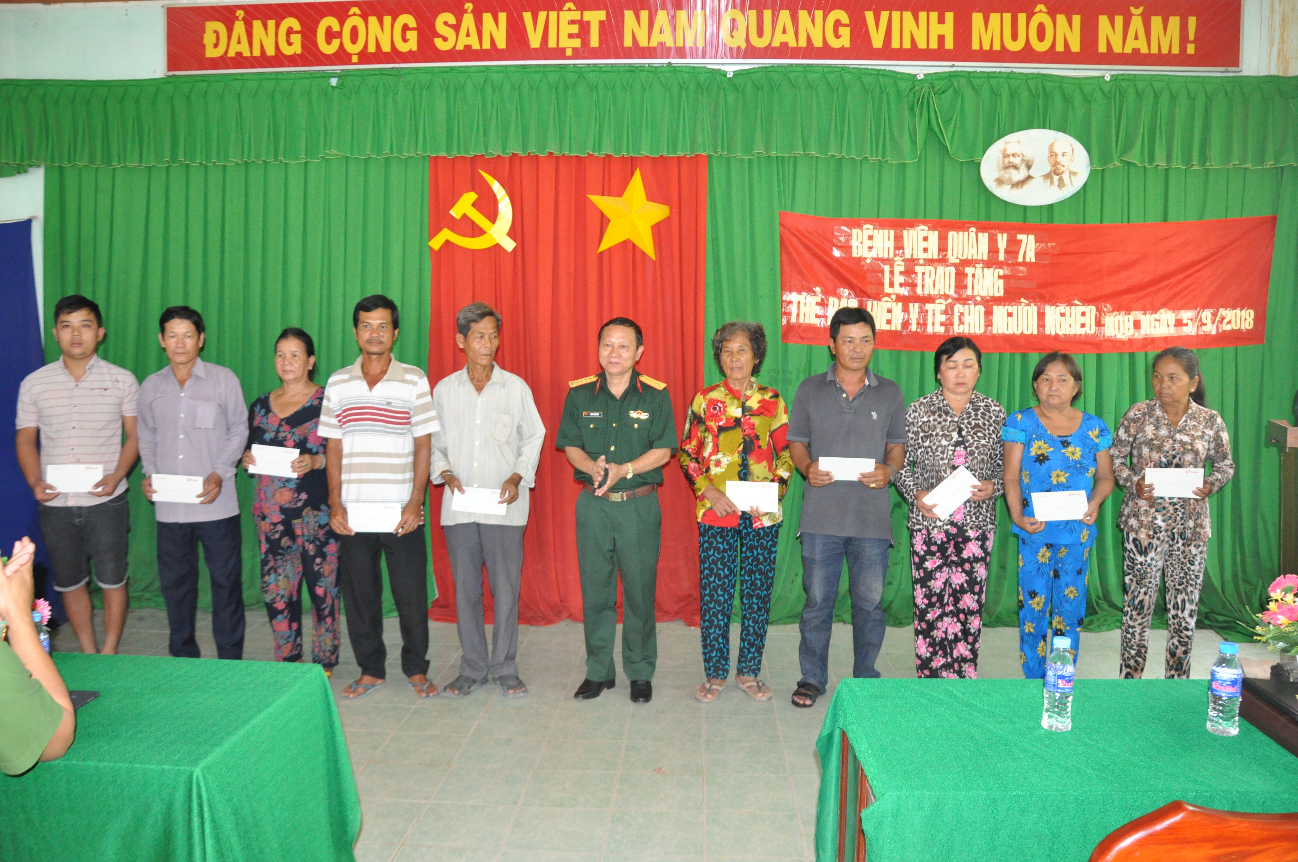 Đại tá Huỳnh Văn Mầm, Bí thư Đảng ủy, Chính ủy Cục Hậu cần trao tặng thẻ bảo hiểm y tế cho người dân nghèo