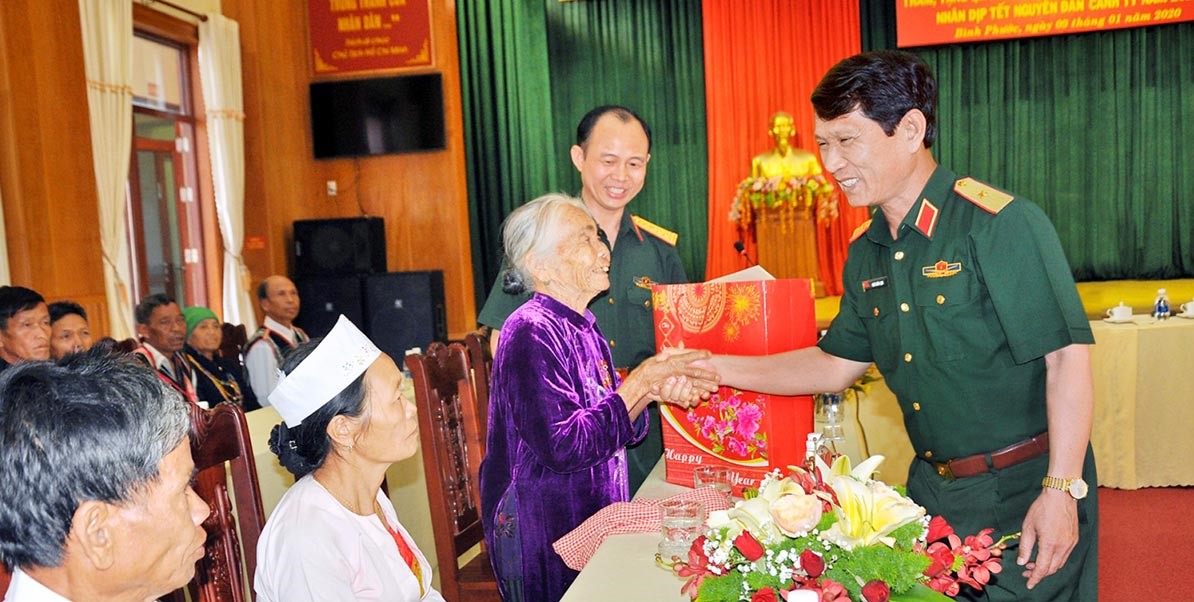 Thiếu tướng Phạm Ngọc Tuấn, Tư lệnh Binh đoàn 16 tặng quà Mẹ Việt Nam Anh hùng Trần Thị Bảy và các gương điển hình trên địa bàn đơn vị đóng quân.