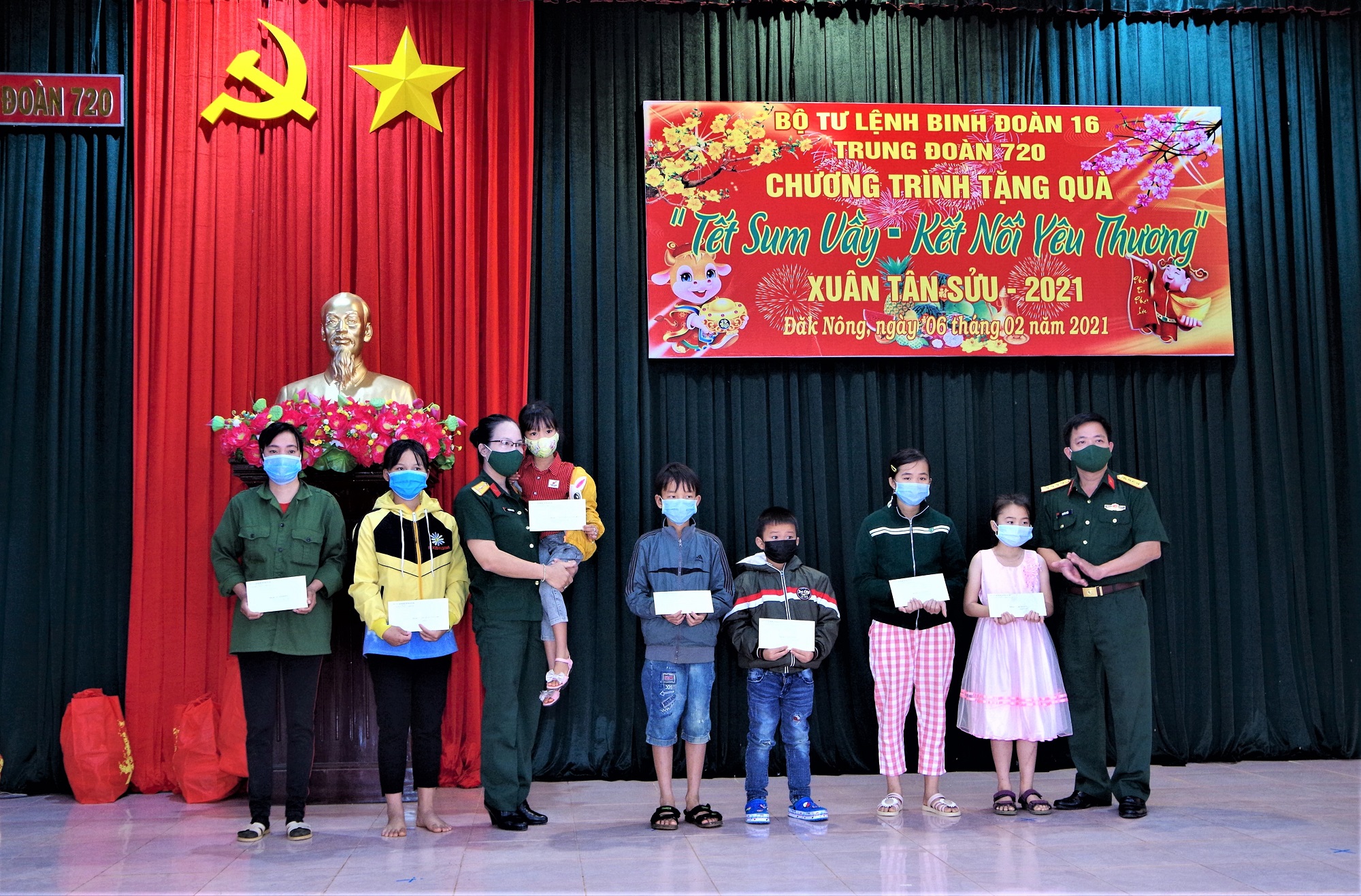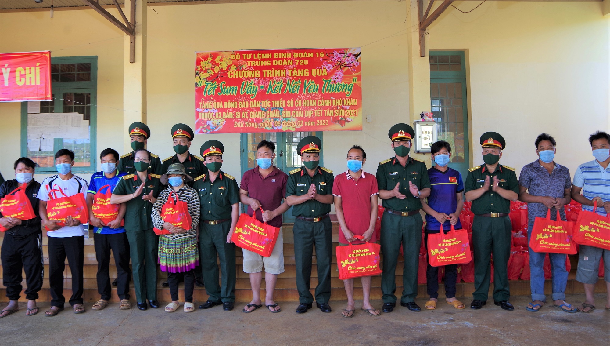 (QK7 Online) - Trong 2 ngày 6 và 7-2, tại Sở chỉ huy Trung đoàn 720, xã (Đắk Ngo) và Đội sản xuất 5, Trung đoàn 726 xã Quảng Trực, huyện Tuy Đức, tỉnh Đắk Nông. Bộ Tư lệnh Binh đoàn 16 phối hợp cùng chính quyền địa phương tổ chức chương trình “Tết sum vầy - kết nối yêu thương” và tặng quà cho công nhân, hộ nhận khoán, đoàn viên, hội viên phụ nữ, các cháu mồ côi, trẻ em mắc bệnh hiểm nghèo và các hộ đồng bàocó hoàn cảnh khó khăn trong vùng dự án nhân dịp Tết Tân Sửu 2021.