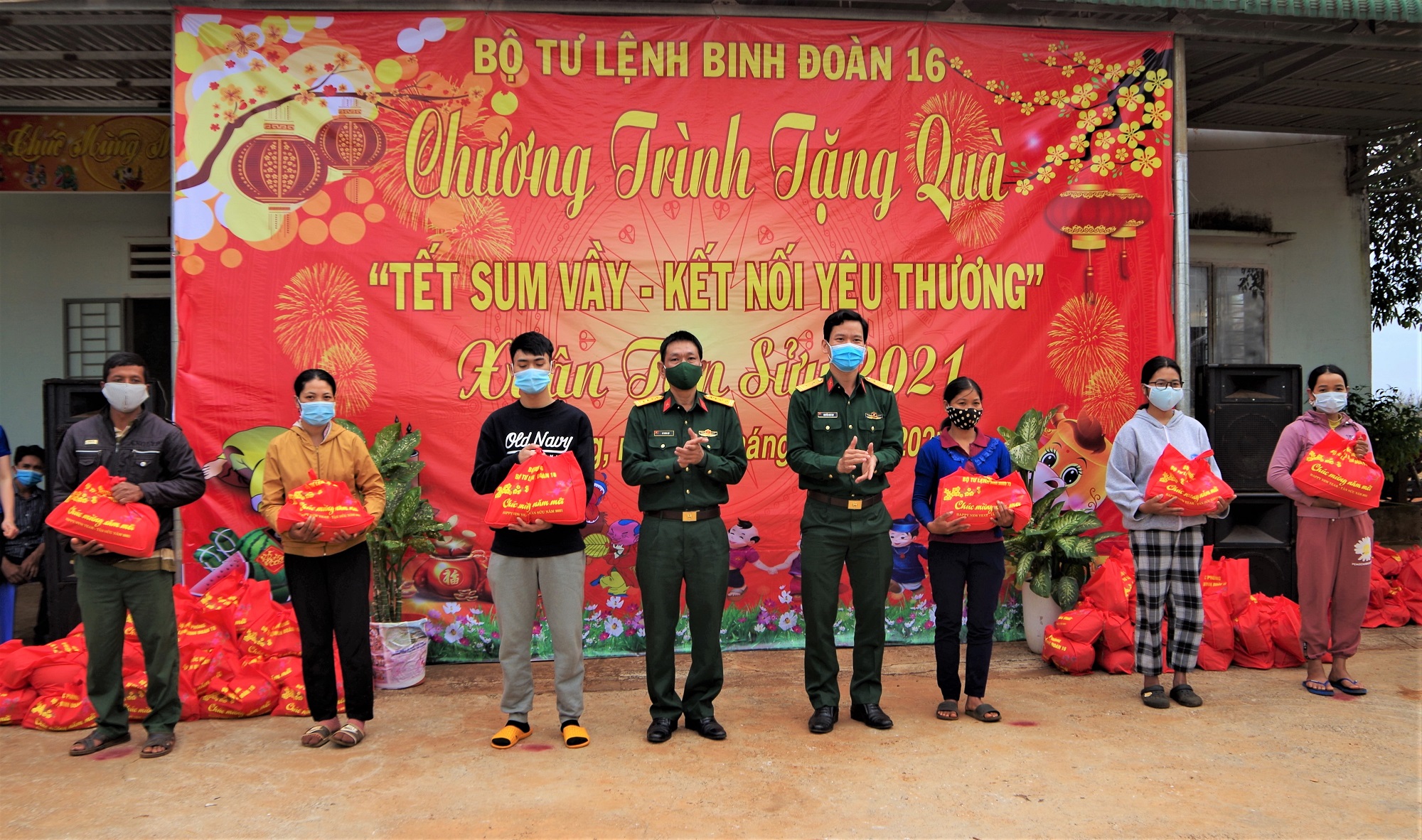 Tại đây, đại diện Phòng Chính trị, Bộ Tư lệnh Binh đoàn 16 và Chỉ huy Trung đoàn 720, Trung đoàn 726 trao 2.500 suất quà. Trong đó Trung đoàn 720 là 1.451 suất, Trung đoàn 726 là 700 suất, mỗi suất quà gồm 2 kg thịt heo, 5 kg gạo nếp và đậu xanh, trị giá 450.000đ/suất cho gia đình công nhân, hộ nhận khoán, hộ đồng bào có hoàn cảnh khó khăn trong vùng dự án với tổng số tiền hơn 1 tỷ đồng. Ngành Công đoàn, Thanh niên, Phụ nữ Binh đoàn 16 cũng đã trao gần 400 suất quà bằng tiền mặt cho đoàn viên công đoàn, thanh niên, hội viên phụ nữ, các cháu mồ côi và trẻ em mắc bệnh hiểm nghèo (mỗi suất quà cho đoàn viên công đoàn, thanh niên, phụ nữ có hoàn cảnh khó khăn là 500 ngàn đồng/suất; các cháu mồ côi trị giá 1 triệu đồng/suất và trẻ em mắc bệnh hiểm nghèo là 10 triệu đồng/suất).