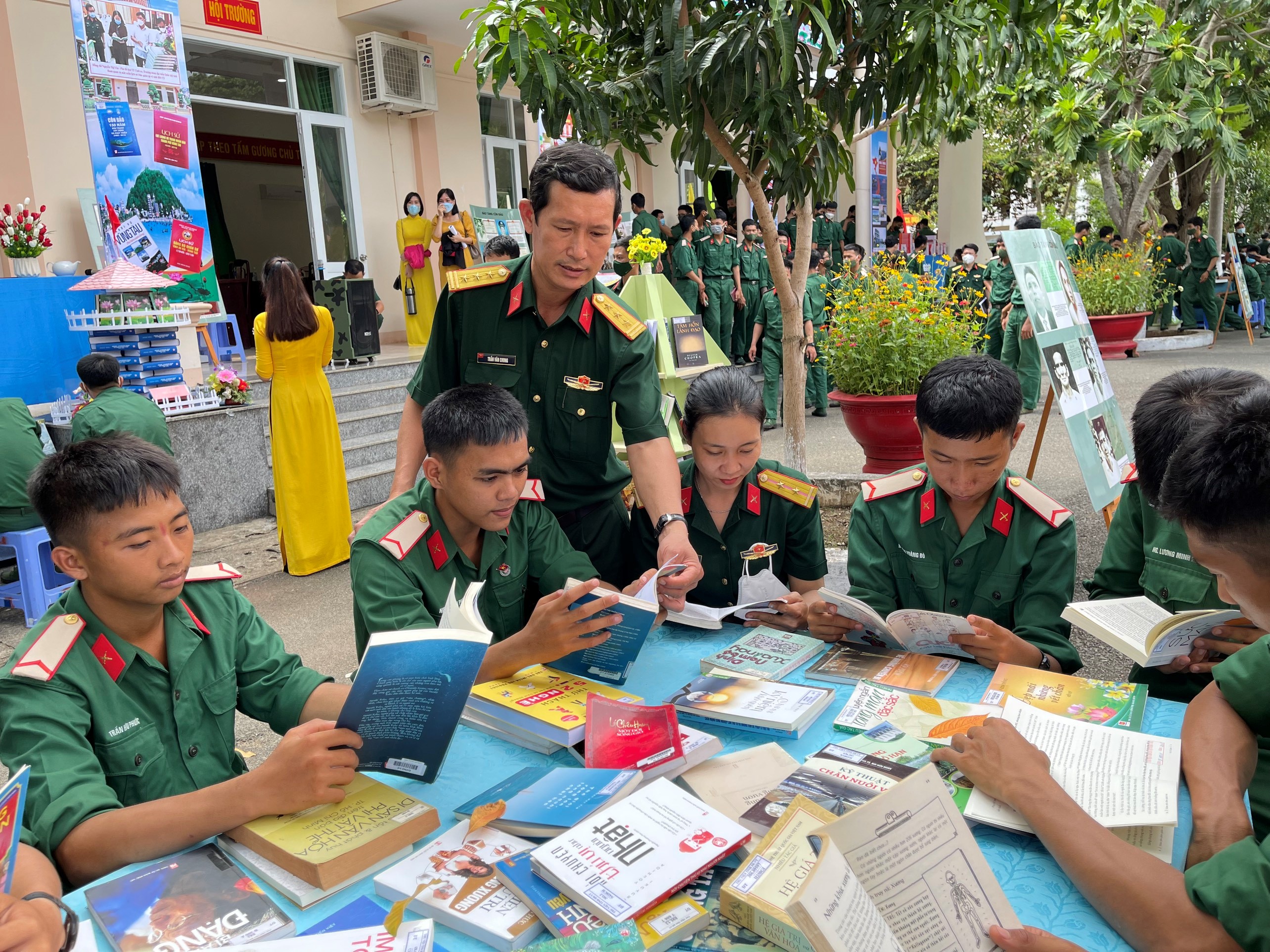Chiến sĩ Đại đội Trinh sát, Bộ Chỉ huy Quân sự tỉnh đọc sách tại trưng bày, triển lãm sách.