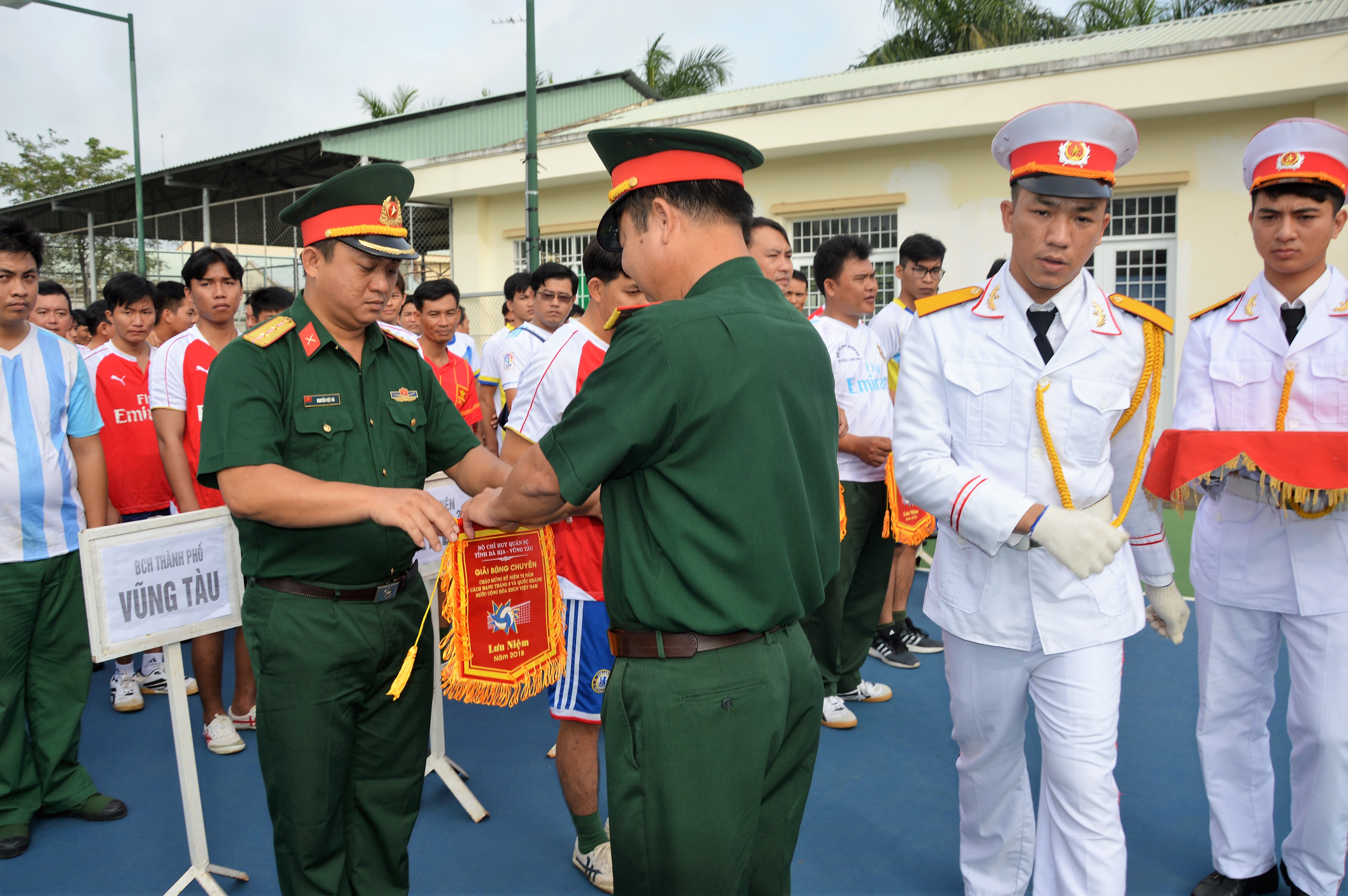 Bộ CHQS tặng cờ lưu niệm cho các đội tham gia.