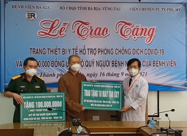 10 máy tạo ôxy nhãn hiệu JAY-5BW (dung tích 5 lít, tốc độ dòng chảy 5 lít/phút) được trao tặng cho Bệnh viện Bà Rịa trị giá 168 triệu đồng do Bộ CHQS tỉnh vận động Viện chuyên tu thị xã Phú Mỹ chung tay đóng góp. Sự đóng góp, hỗ trợ kịp thời của Bộ CHQS tỉnh và Viện chuyên tu thị xã Phú Mỹ góp phần tạo điều kiện cho việc điều trị bệnh nhân Covid-19, nhất là các bệnh nhân có diễn biến nặng.
