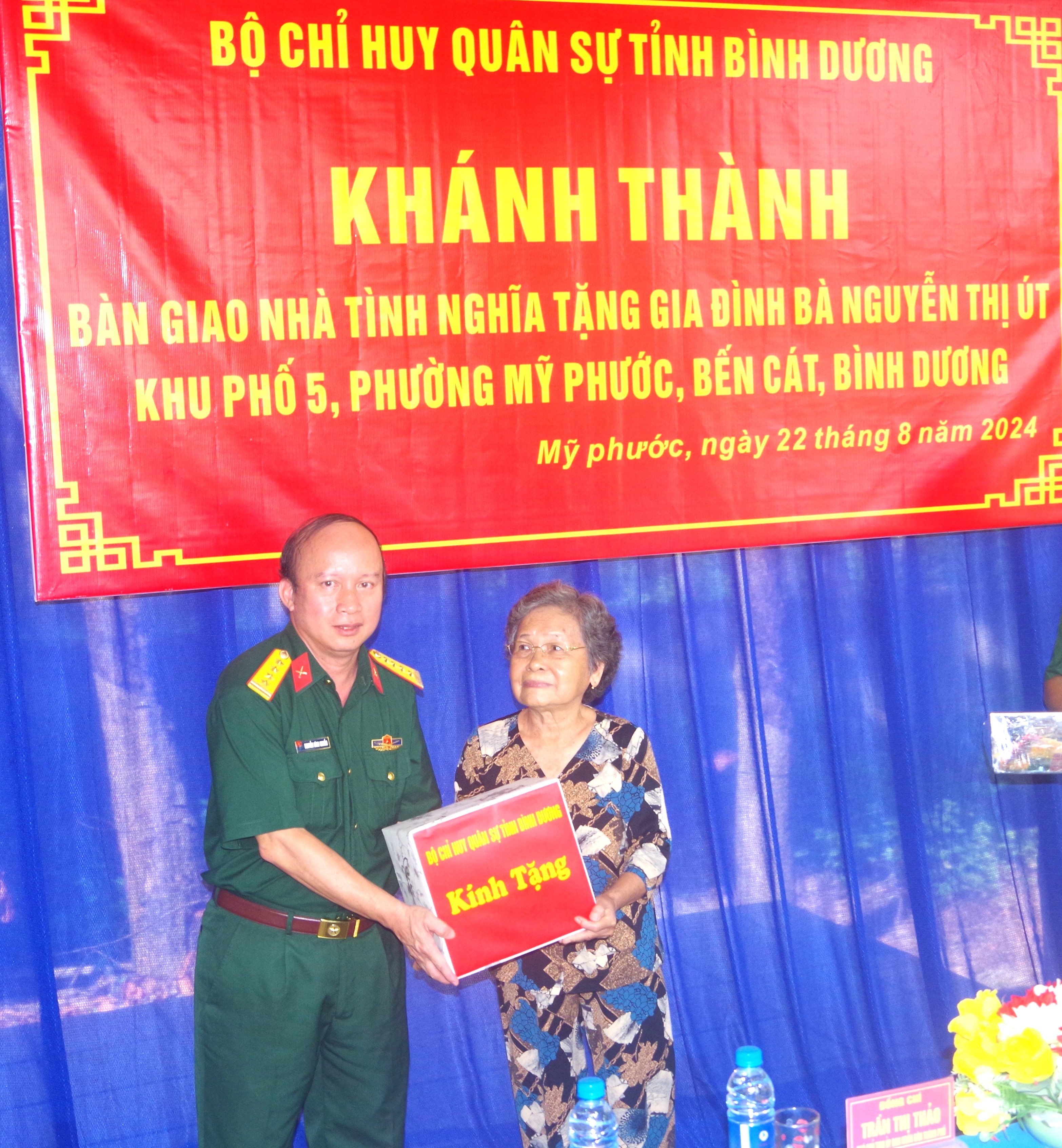 Phát biểu tại lễ khánh thành và bàn giao nhà, Đại tá Nguyễn Đình Chuẩn, Chính ủy Bộ CHQS tỉnh Bình Dương chúc mừng gia đình bà Nguyễn Thị Út đón nhận niềm vui được ở trong ngôi nhà mới khang trang, chắc chắn, góp phần giúp gia đình bà có điều kiện tốt hơn chăm lo sức khỏe bản thân. Đại tá Nguyễn Đình Chuẩn, cho biết: Việc xây dựng “Nhà tình nghĩa” tặng các gia đình chính sách là hoạt động thiết thực, ý nghĩa, thể hiện truyền thống, đạo lý “Uống nước nhớ nguồn”, “Ăn quả nhớ người trồng cây” và tình cảm, nghĩa cử cao đẹp “Bộ đội Cụ Hồ”, góp phần bảo đảm an sinh xã hội, xây dựng nông thôn mới, tạo động lực để các hộ gia đình có thêm điều kiện lao động sản xuất, vươn lên trong cuộc sống.
