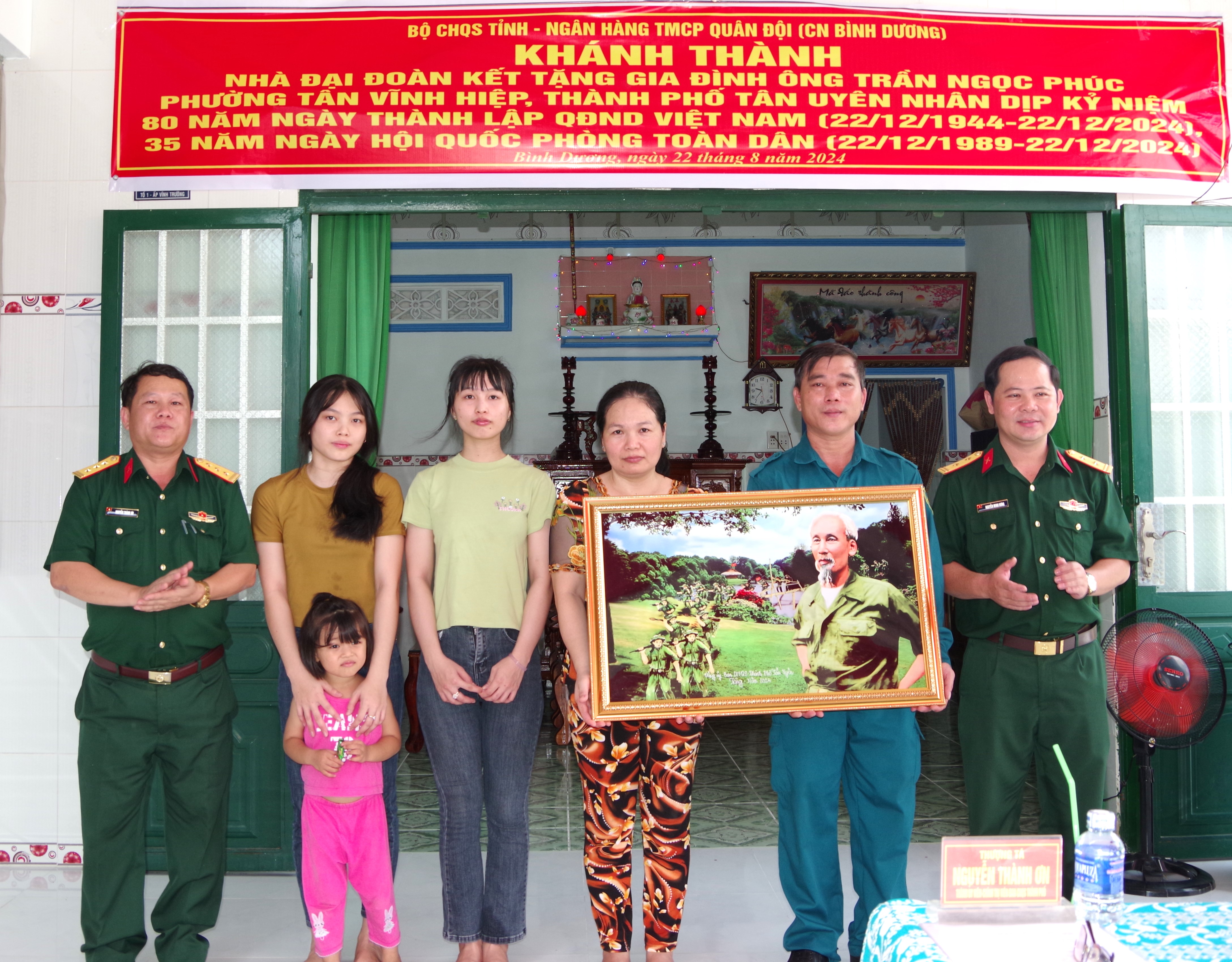 Cùng ngày, Thượng tá Trần Anh Hùng, Phó Chủ nhiệm Chính trị Bộ CHQS tỉnh trao “Nhà đại đoàn kết” tặng gia đình ông Trần Ngọc Phúc, ngụ tại phường Tân Vĩnh Hiệp, thành phố Tân Uyên.