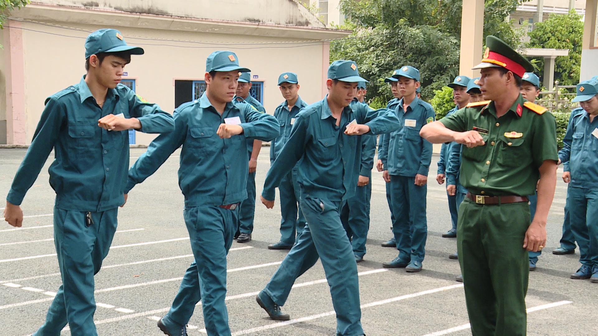 Kiểm tra điều lệnh đội ngũ dân quân.
