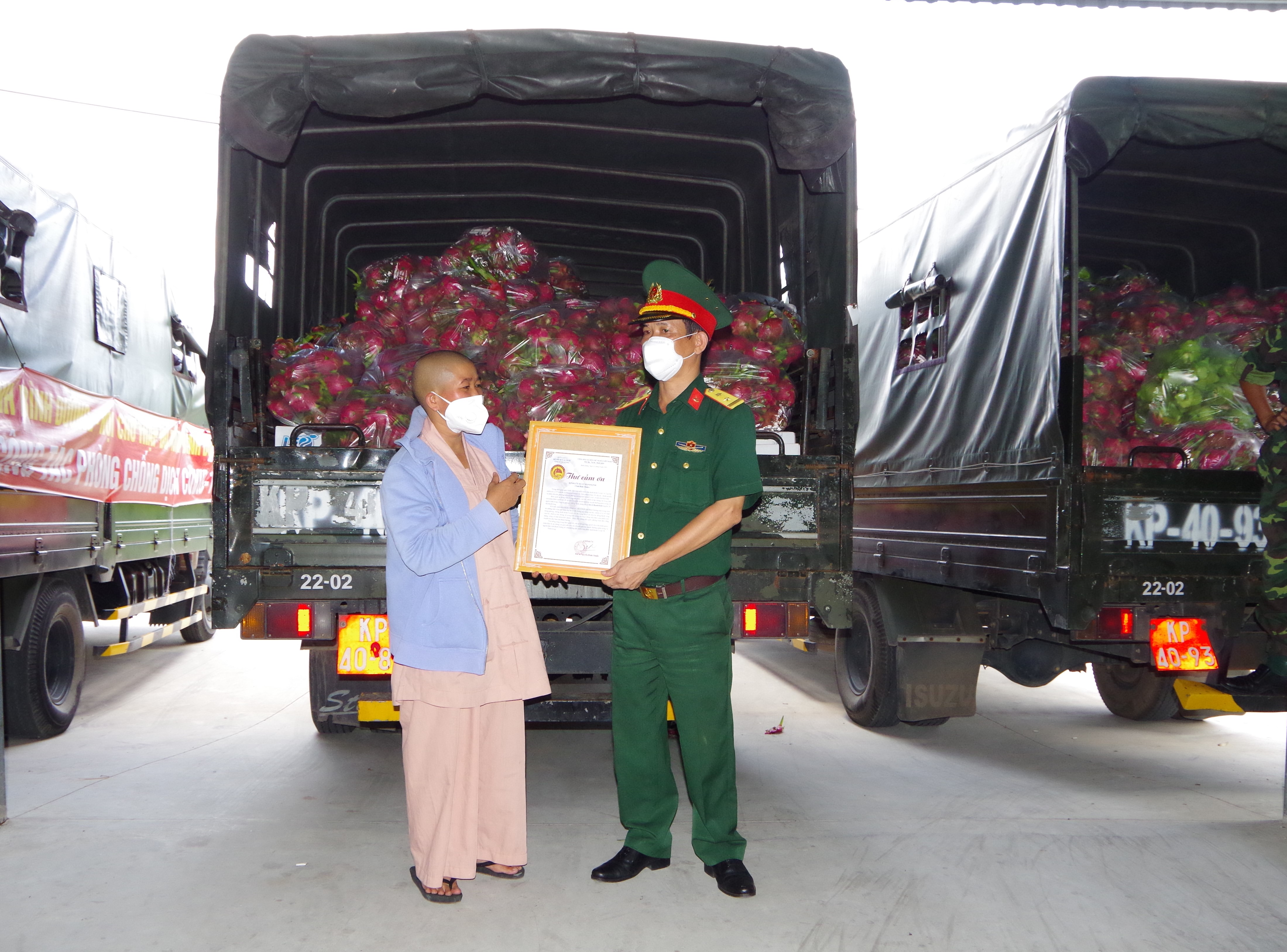 Thủ trưởng Bộ CHQS tỉnh Bình Dương chân thành cảm ơn tấm lòng của Sư cô Hạnh Kính với món quà trên, mong muốn sư cô và các tăng ni phật tử tiếp tục đồng hành cùng quân – dân tỉnh Bình Dương chung tay vượt qua đại dịch.