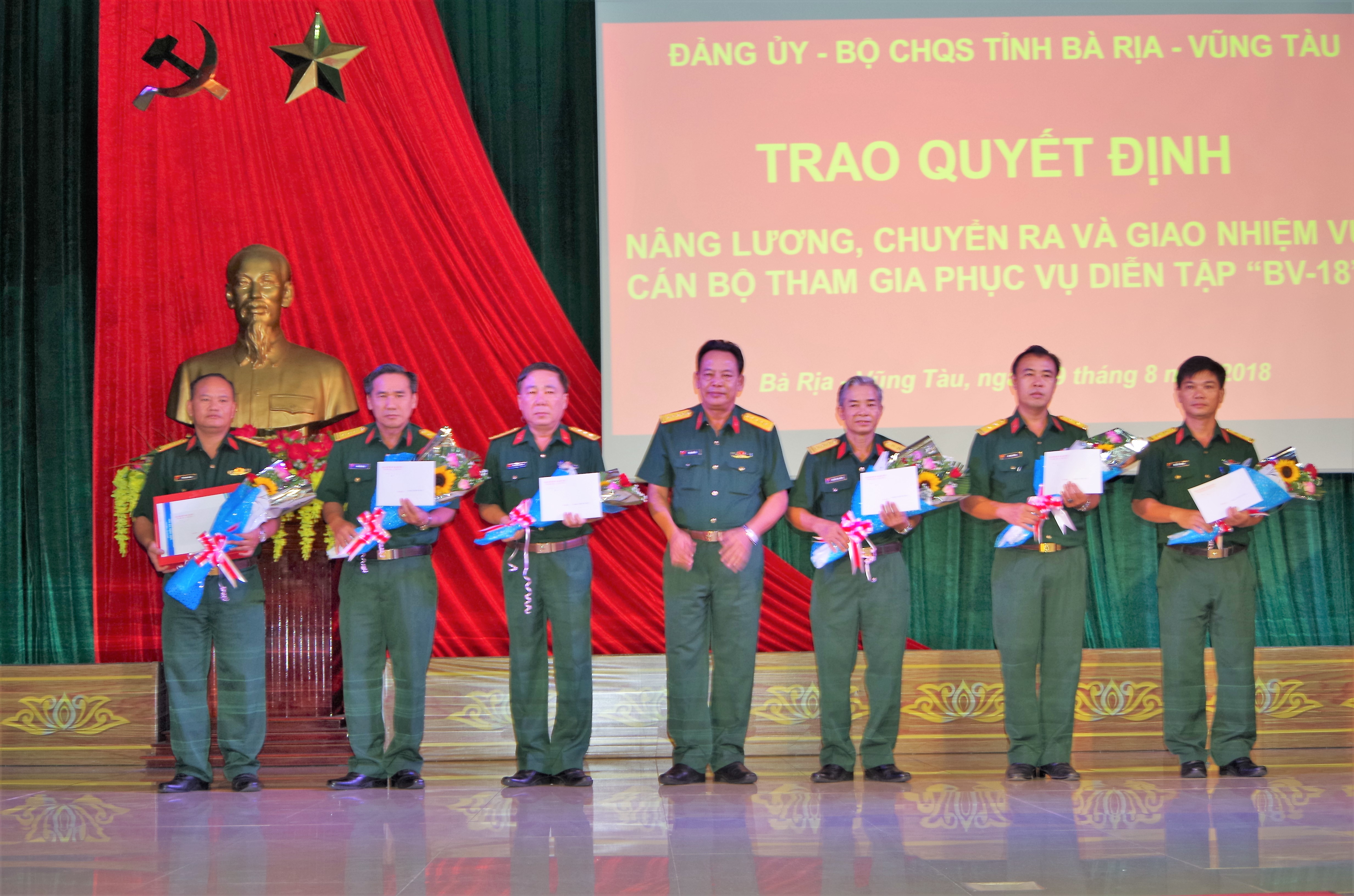 Nhân dịp này, Đảng ủy, Bộ CHQS tỉnh trao quyết định nâng lương, bổ nhiệm, chuyển ra cho 8 đồng chí cán bộ, sĩ quan thuộc LLVT tỉnh.