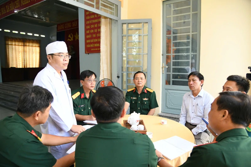 Đoàn công tác nghe báo cáo công tác khám sơ tuyển sức khỏe tại xã Trà Vong.