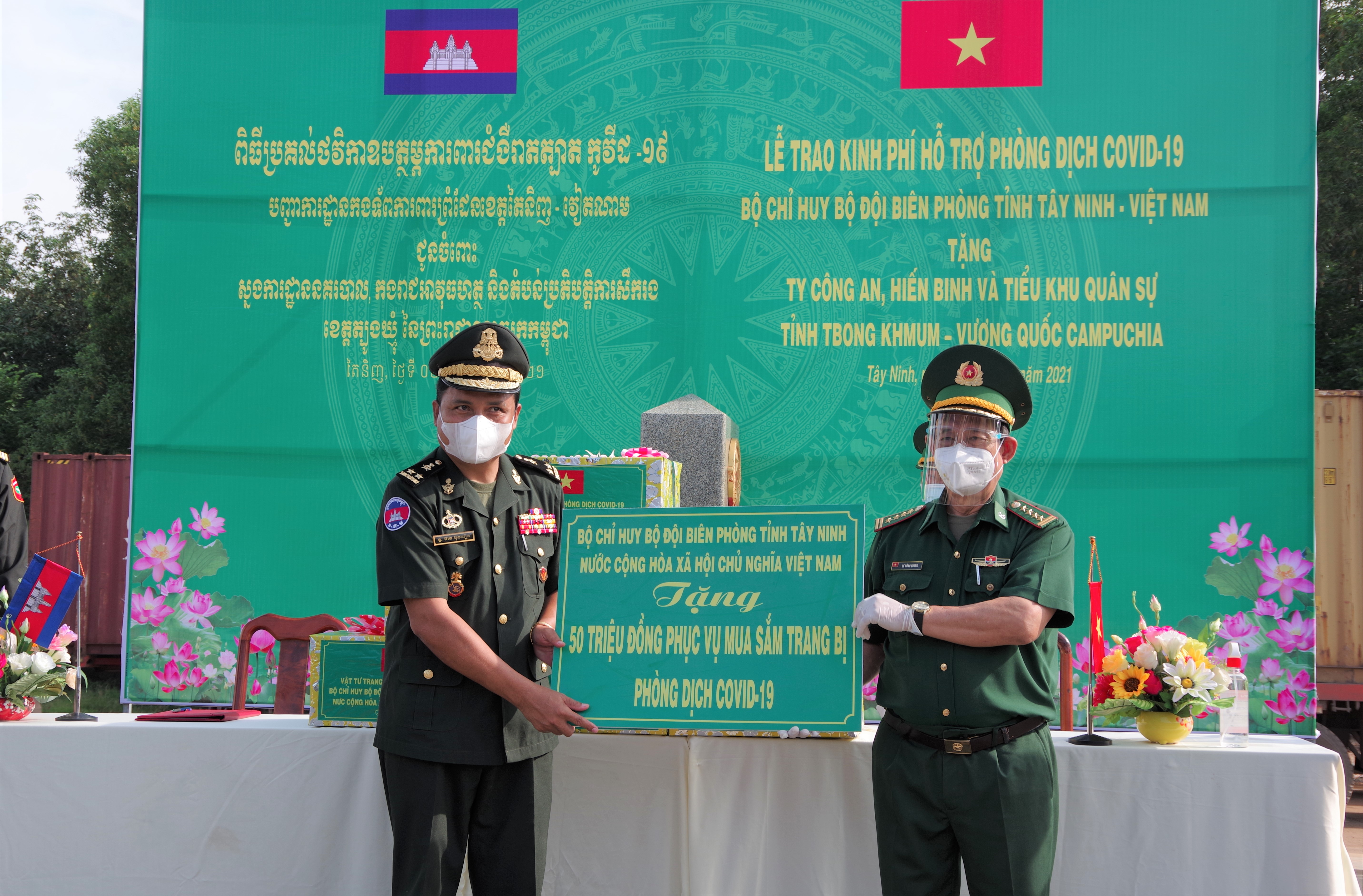 Đại tá Lê Hồng Vương - Chỉ huy trưởng Bộ Chỉ huy BĐBP tỉnh Tây Ninh trao bảng tượng trưng 50 triệu cho Trung tướng Eat Bun Thuon - Chỉ huy trưởng Tiểu khu Quân sự tỉnh Tbong Khmum.