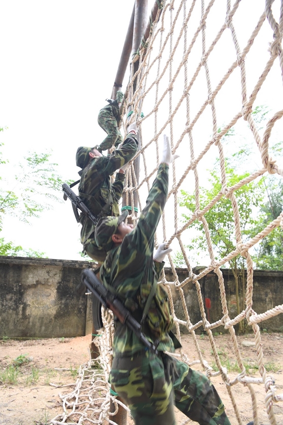 Tiểu đội Công binh xung kích huấn luyện tình huống vượt tường lưới.