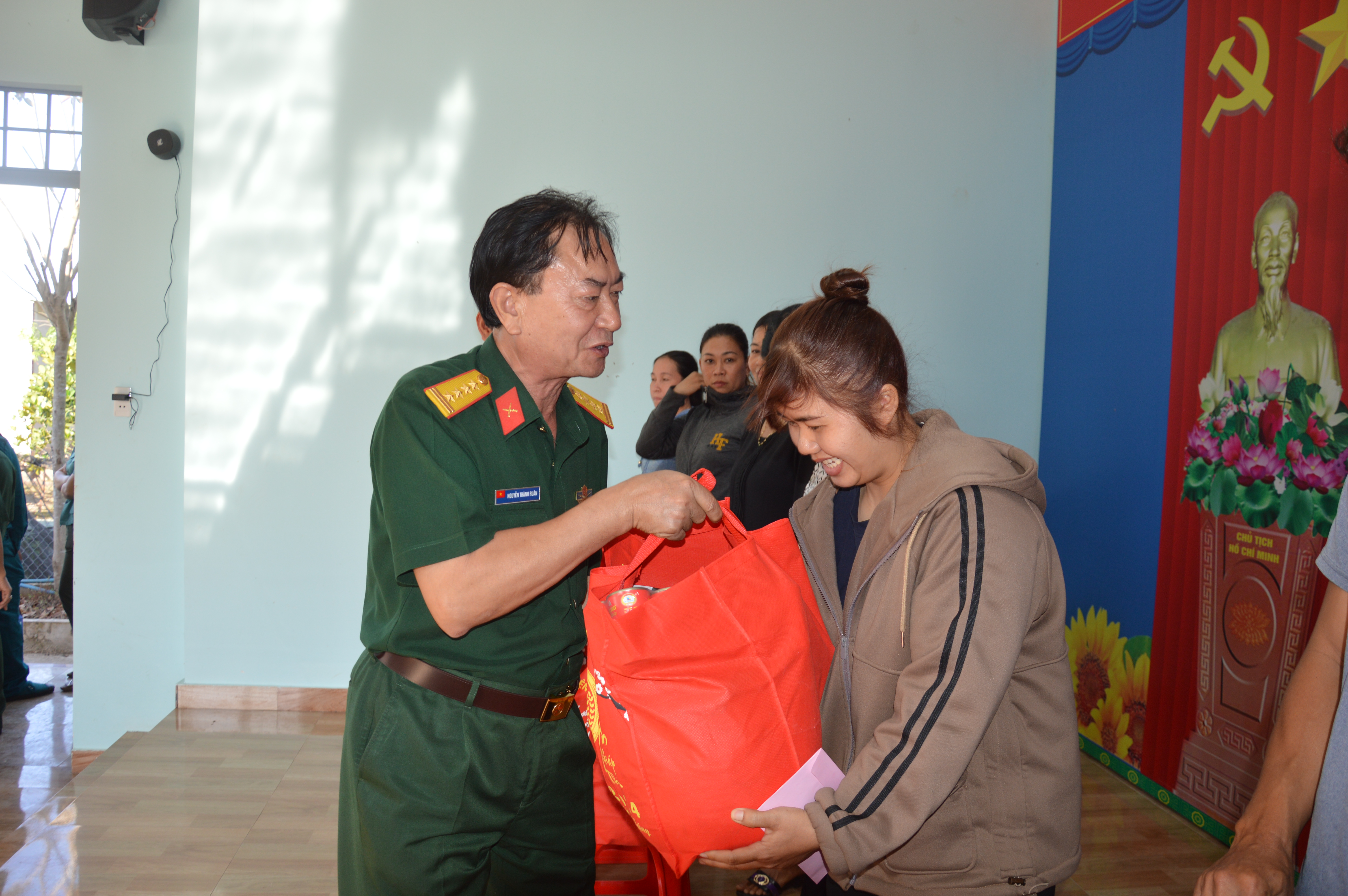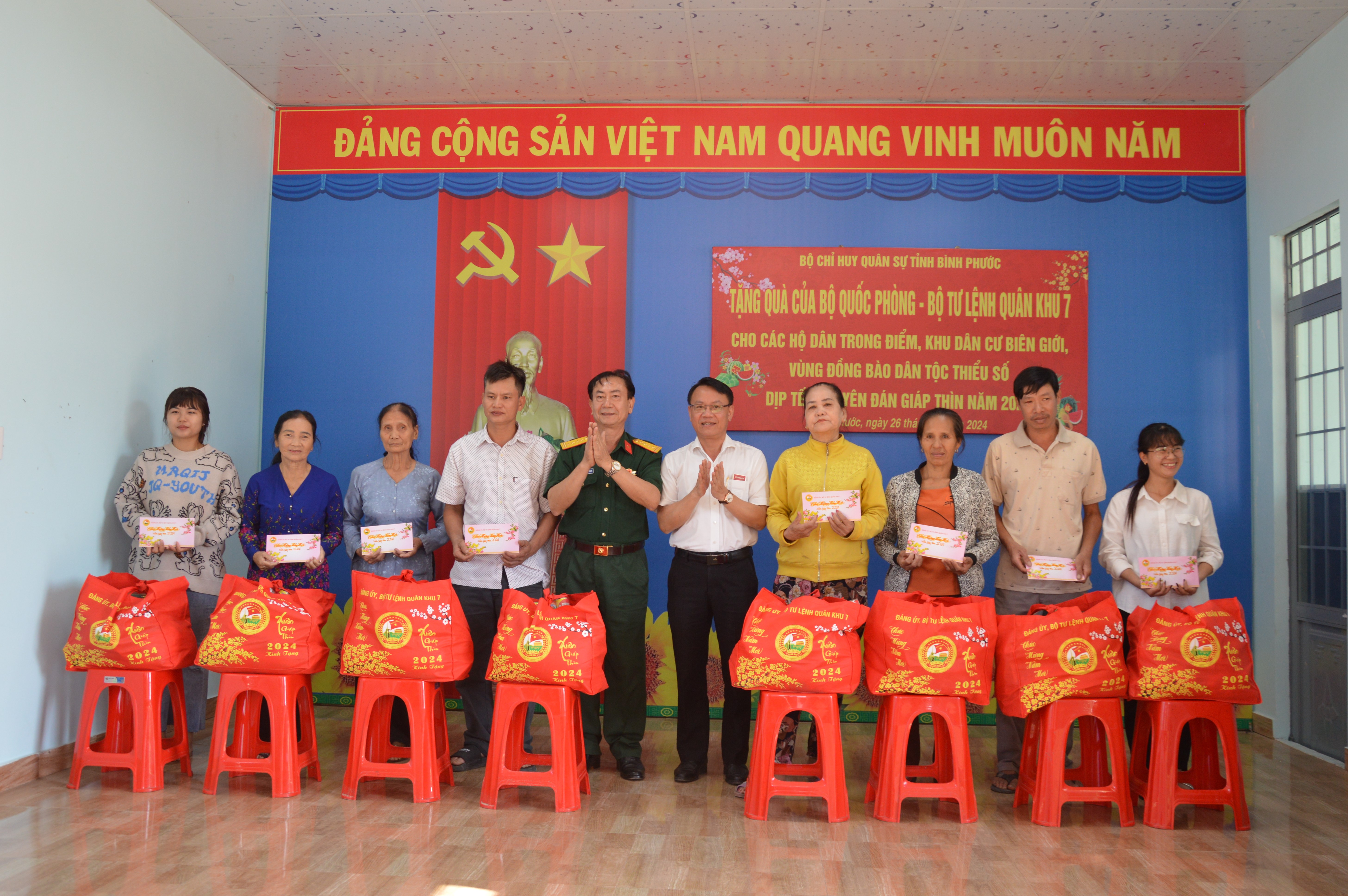 Theo đó, Bộ Quốc phòng, Bộ Tư lệnh Quân khu 7 ủy quyền cho Bộ CHQS tỉnh tặng quà cho 162 hộ gia đình trong điểm dân cư liền kề trên địa bàn huyện Bù Đốp, mỗi hộ gia đình được Bộ Quốc phòng, Bộ Tư lệnh Quân khu 7 tặng 1 phần quà trị giá 500.000 đồng và 500.000 đồng tiền mặt.