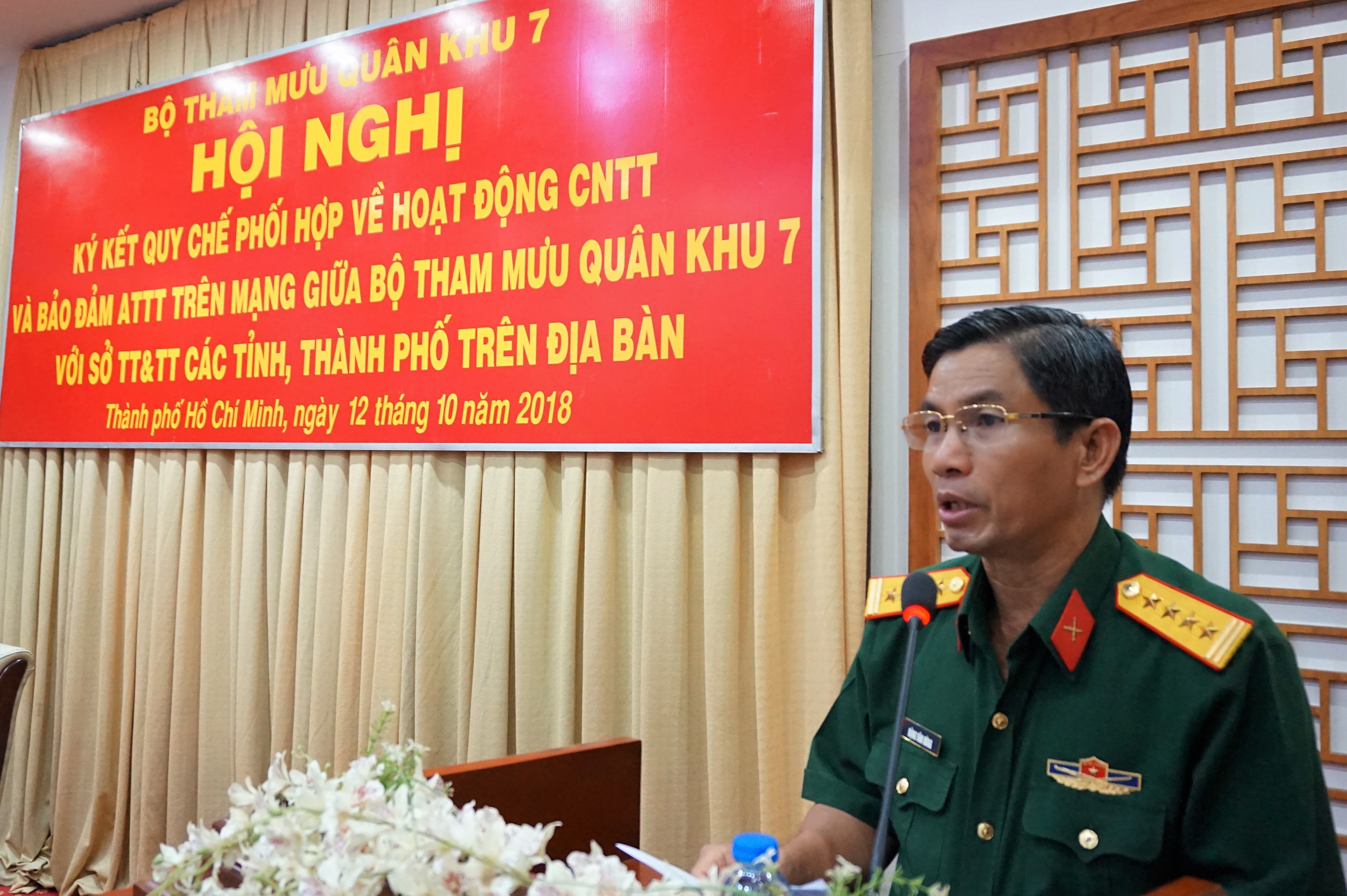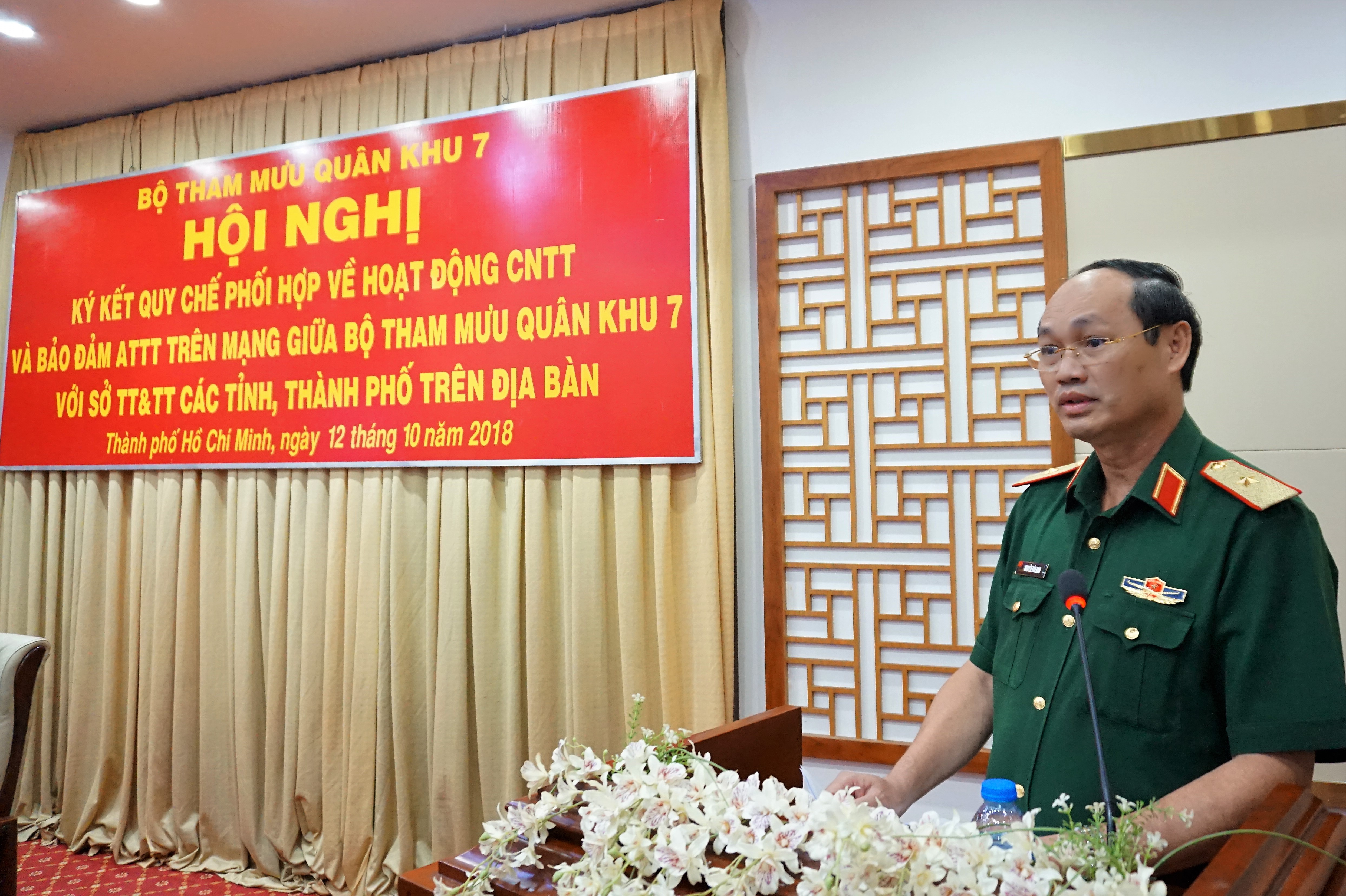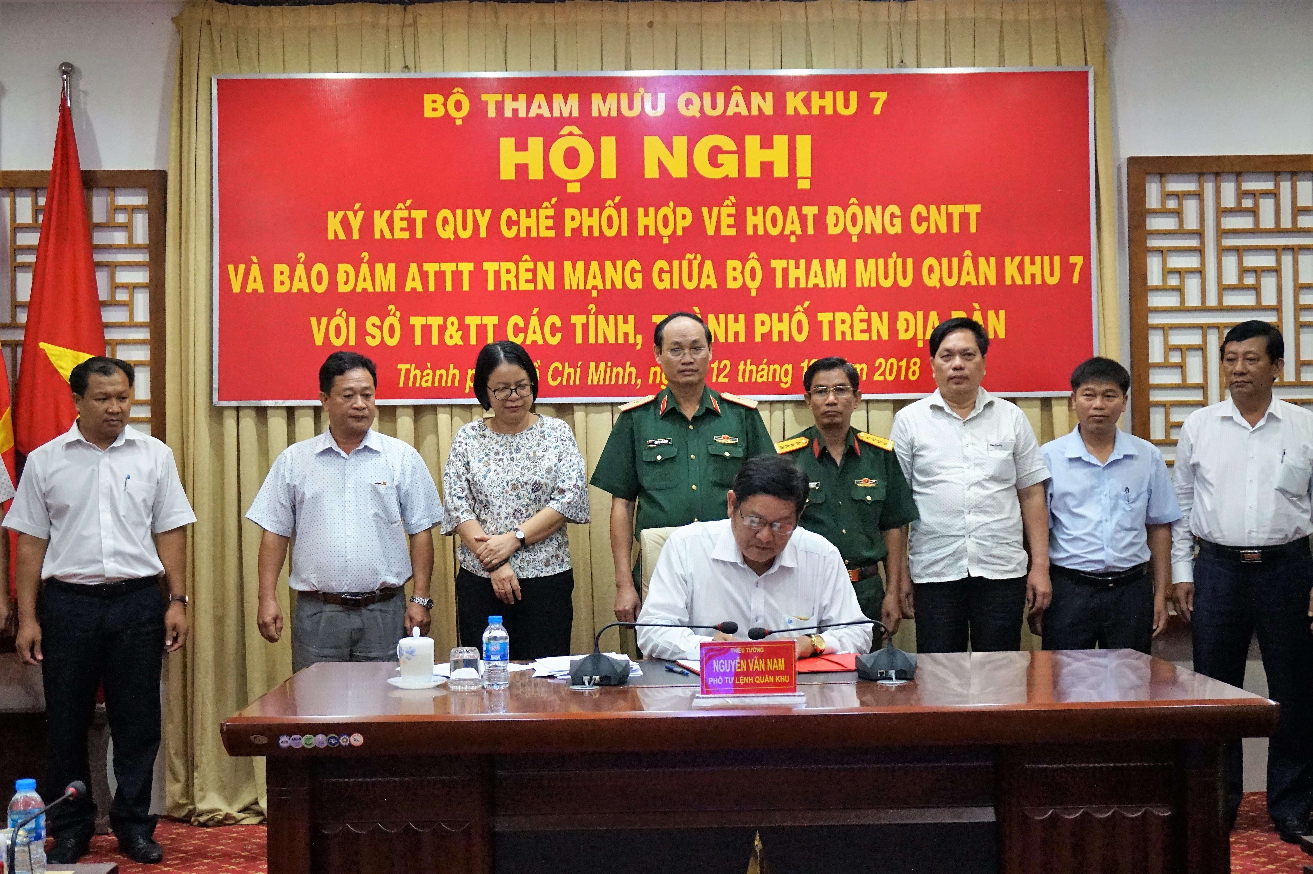 Nội dung phối hợp: Bộ Tham mưu Quân khu 7 với Sở Thông tin và Truyền thông các tỉnh, thành phố trên địa bàn sẽ cùng tuyên truyền, giáo dục nâng cao nhận thức về hoạt động đẩy mạnh ứng dụng, phát triển CNTT trong nhiệm vụ QP-AN và bảo đảm an ninh, an toàn thông tin trên mạng; Xây dựng, bảo đảm an ninh an toàn, phát triển hệ thống hạ tầng thông tin từ tỉnh, thành phố đến các cơ quan quân sự, đồng bộ, từng bước hiện đại, liên thông đáp ứng yêu cầu đẩy mạnh ứng dụng và phát triển CNTT; Phối hợp, xử lý, khắc phục sự cố về mất an toàn, an ninh thông tin trên mạng; Đào tạo, bồi dưỡng kiến thức, tập huấn, diễn tập về an toàn, an ninh thông tin trên mạng; Công tác nghiên cứu Khoa học công nghệ; Kiểm tra, đánh giá thực trạng hệ thống mạng và bảo đảm an ninh, an toàn thông tin trên mạng phục vụ nhiệm vụ quốc phòng - an ninh …