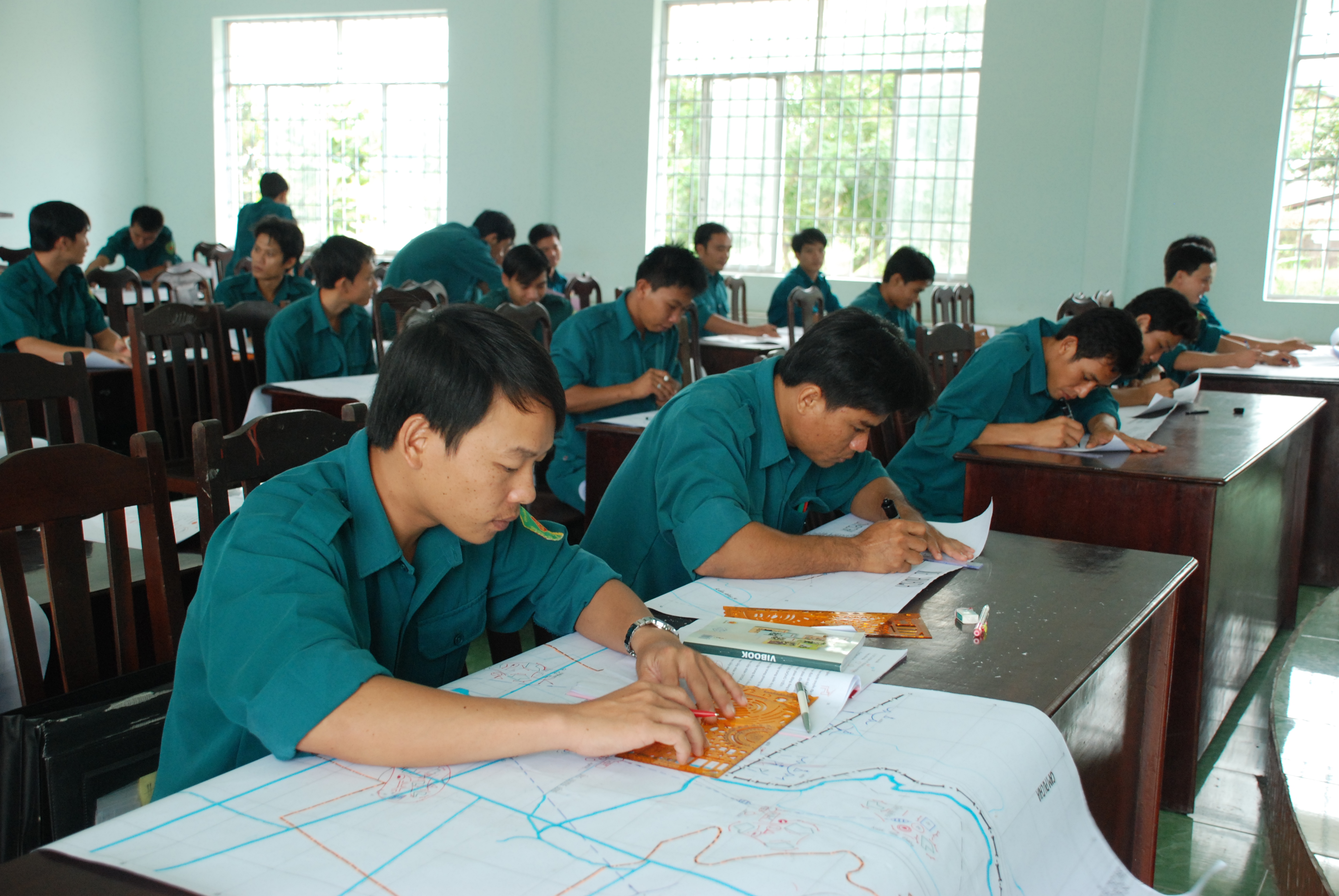 Các học viên Trường Quân sự tỉnh Long An trong giờ học tập trên giảng đường