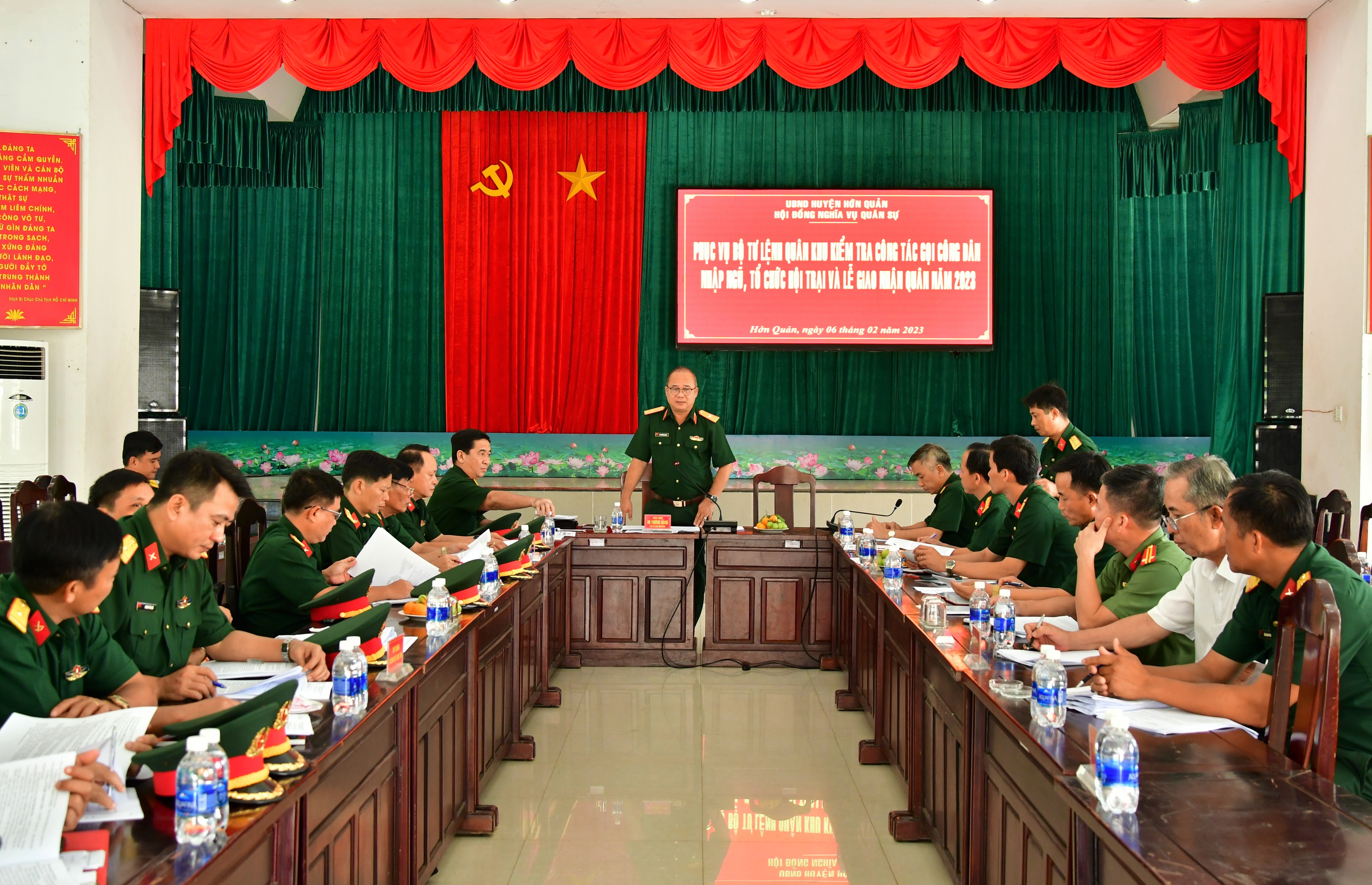 Đoàn công tác Quân khu cũng đã kiểm tra công tác gọi công dân nhập ngũ, tổ chức Hội trại tòng quân, Lễ giao nhận quân tại Ban CHQS huyện Hớn Quản. Đến nay, Hội đồng NVQS huyện đã phát lệnh NVQS và nghĩa vụ Công an cho 172 thanh niên. Đồng thời chỉ đạo Hội đồng NVQS cấp xã, thị trấn tham mưu cấp ủy, chính quyền địa phương làm tốt công tác chuẩn bị Hội trại tòng quân và Lễ giao nhận quân; đảm bảo giao nhận quân nhanh, gọn, trang trọng, an toàn.