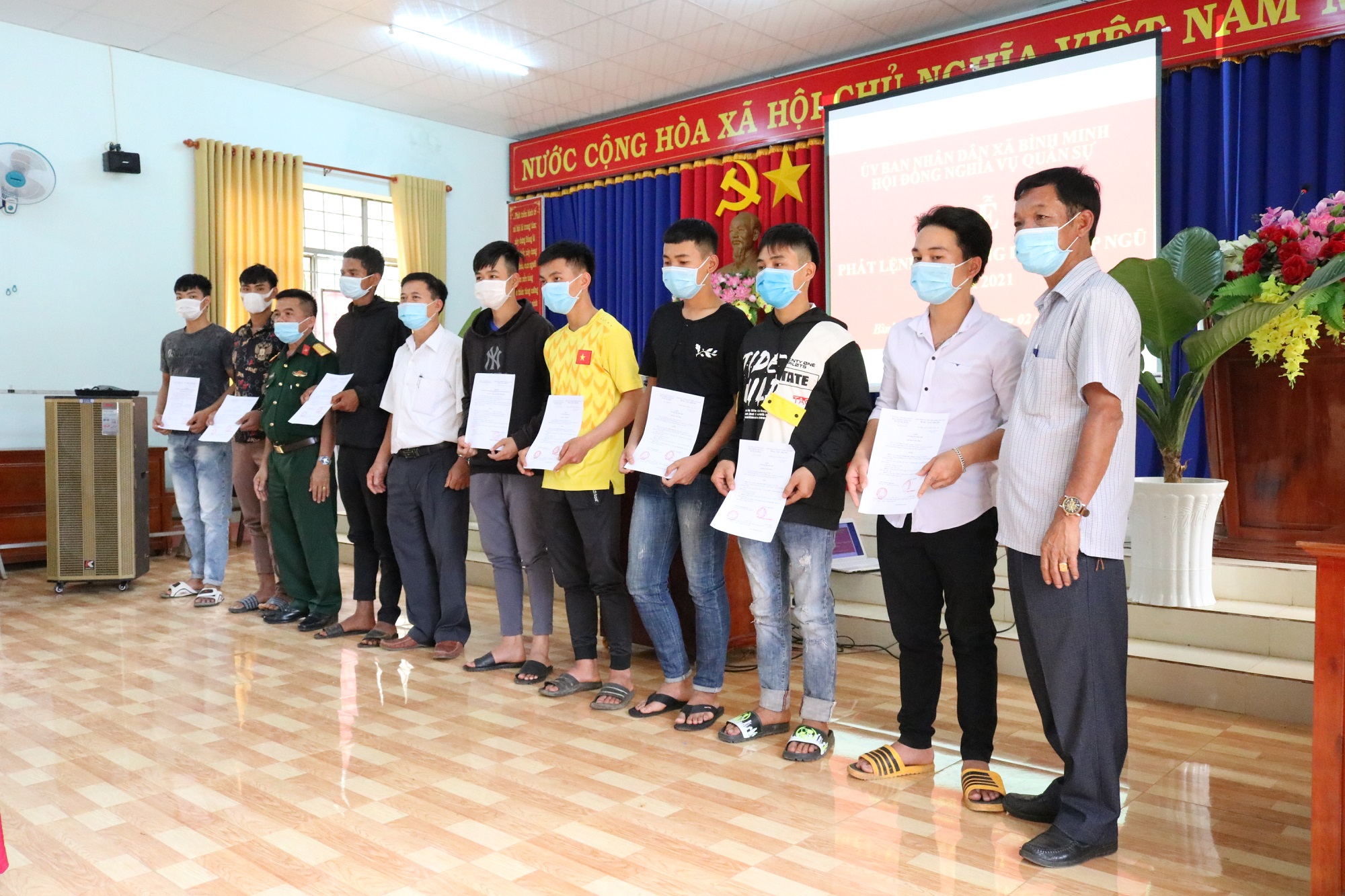 Đại diện Hội đồng nghĩa vụ quân sự huyện Bù Đăng và chính quyền xã Bình Minh trao lệnh gọi công dân nhập ngũ năm 2021.