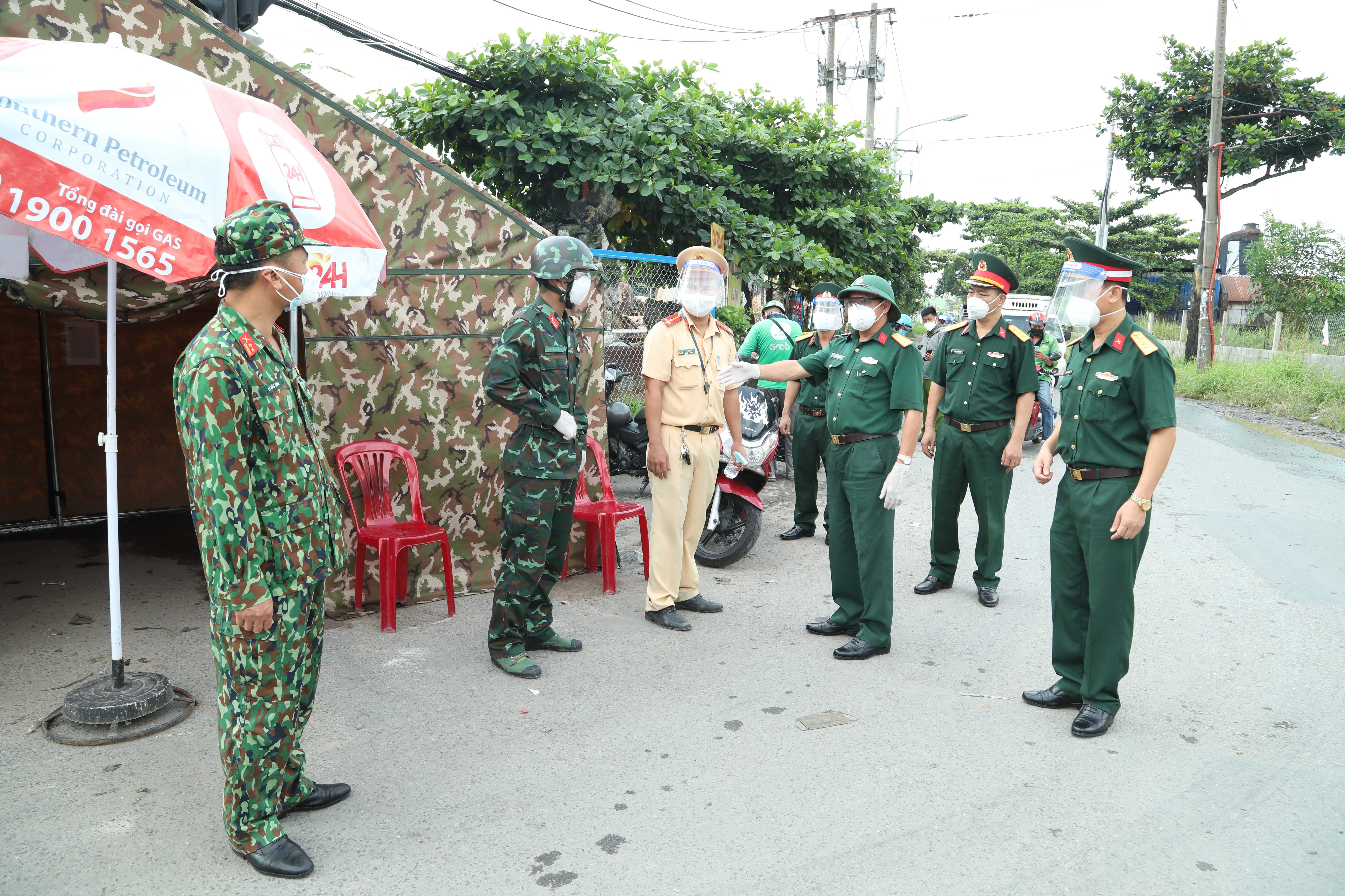 Theo đó, tại các xã phường, ấp, khu phố, nhất là các địa nàn thực hiện “khóa chặt, đông cứng, vùng đỏ” của tâm dịch, nơi đang quyết liệt thực hiện nghiêm Chỉ thị 16 của Chính phủ, đâu đâu cũng thấy màu xanh quân phục dã chiến của sĩ quan, chiến sĩ.