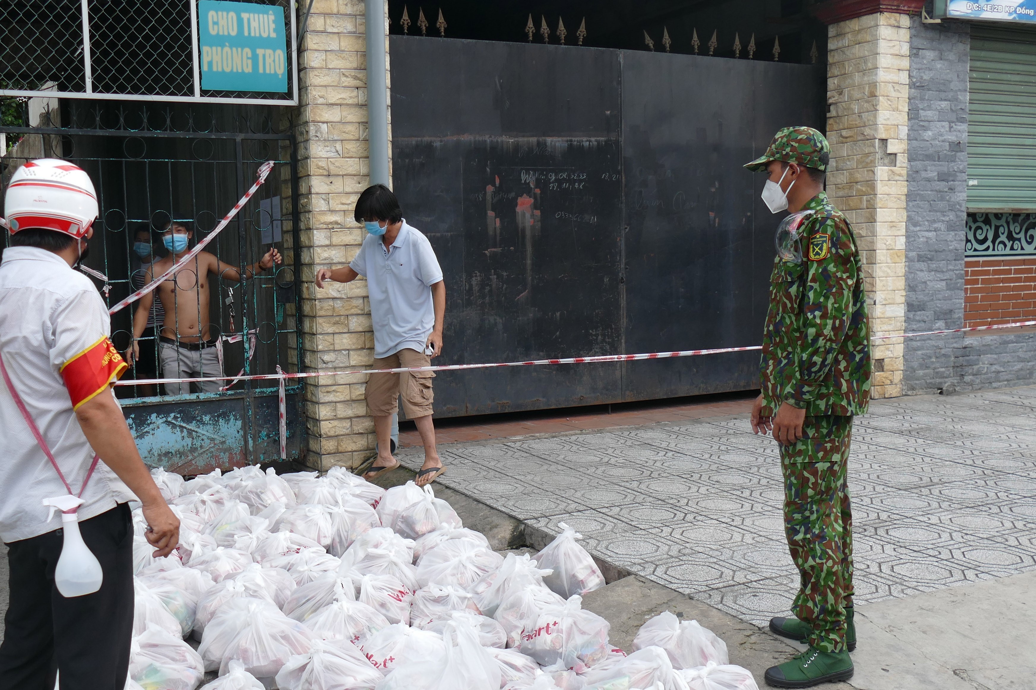 Bộ đội Trung đoàn 3, Sư đoàn 9 phối hợp cấp phát lương thực và như yếu phẩm thiết yếu cho người dân ở các khu nhà trọ tại Bình Dương.