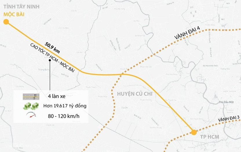 Dự án cao tốc TP.HCM – Mộc Bài có tổng chiều dài khoảng 51 km, trong đó 24,7 km đi qua TP.HCM và 26,3 km qua Tây Ninh, đi từ nút giao Vành đai 3 (Củ Chi) đến cửa khẩu Mộc Bài.