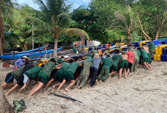 Cán bộ, chiến sĩ Lữ đoàn Công binh 270 giúp nhân dân đưa thuyền vào bờ tránh bão. Ảnh: Thành Chung.