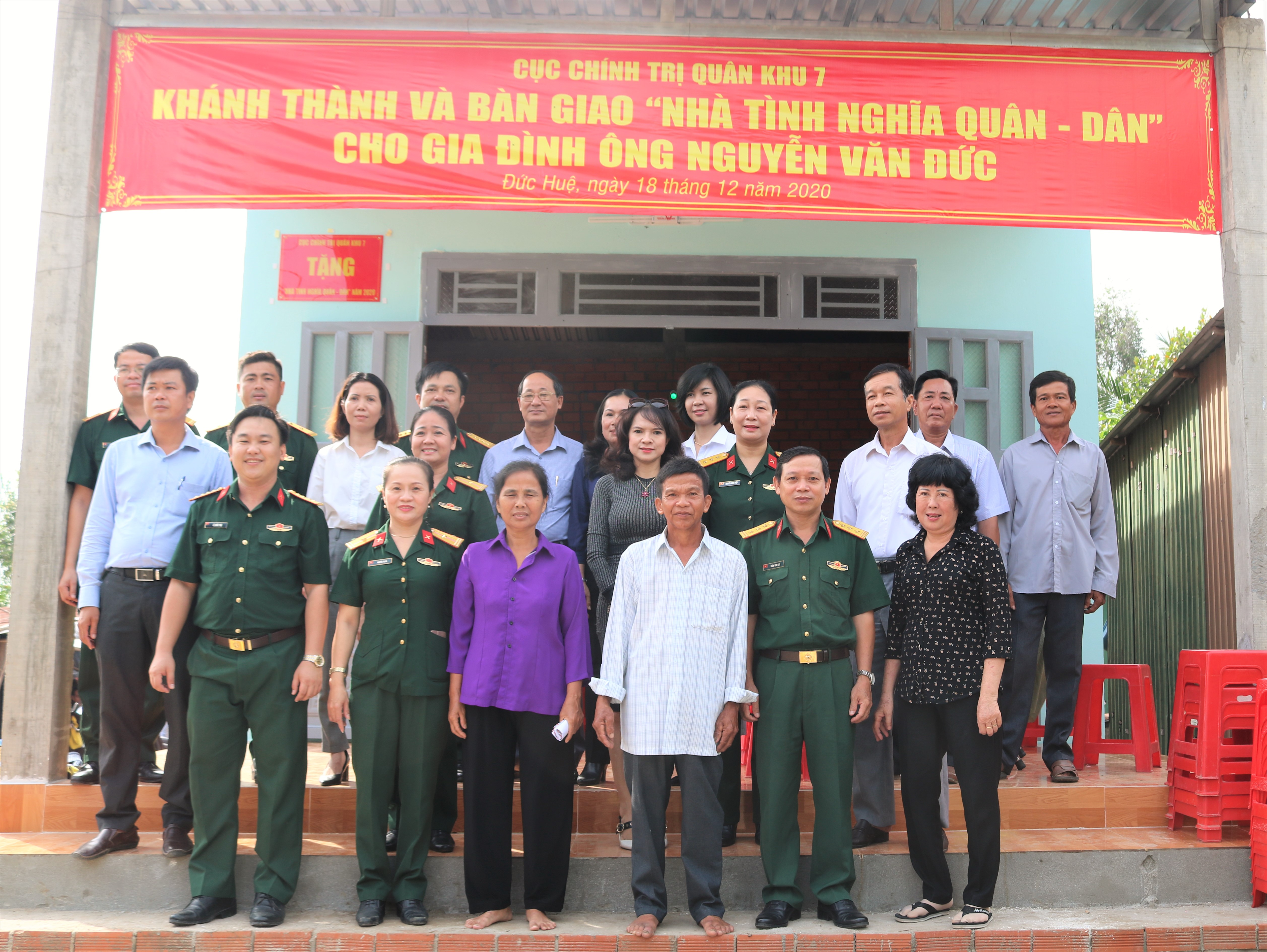 (QK7 Online) – Ngày 18/12, Cục Chính trị Quân khu 7 tổ chức trao “Nhà tình nghĩa quân - dân" cho gia đình ông Nguyễn Văn Đức tại ấp 1, xã Bình Hòa Nam, huyện Đức Huệ, tỉnh Long An. Dự buổi trao tặng nhà có Đại tá Nguyễn Doãn Nam, Trưởng phòng Kế hoạch Tổng hợp, Cục Chính trị Quân khu; Đại tá Nguyễn Văn Bắc, Tổng Biên tập Báo Quân khu 7 và đại diện lãnh đạo địa phương.