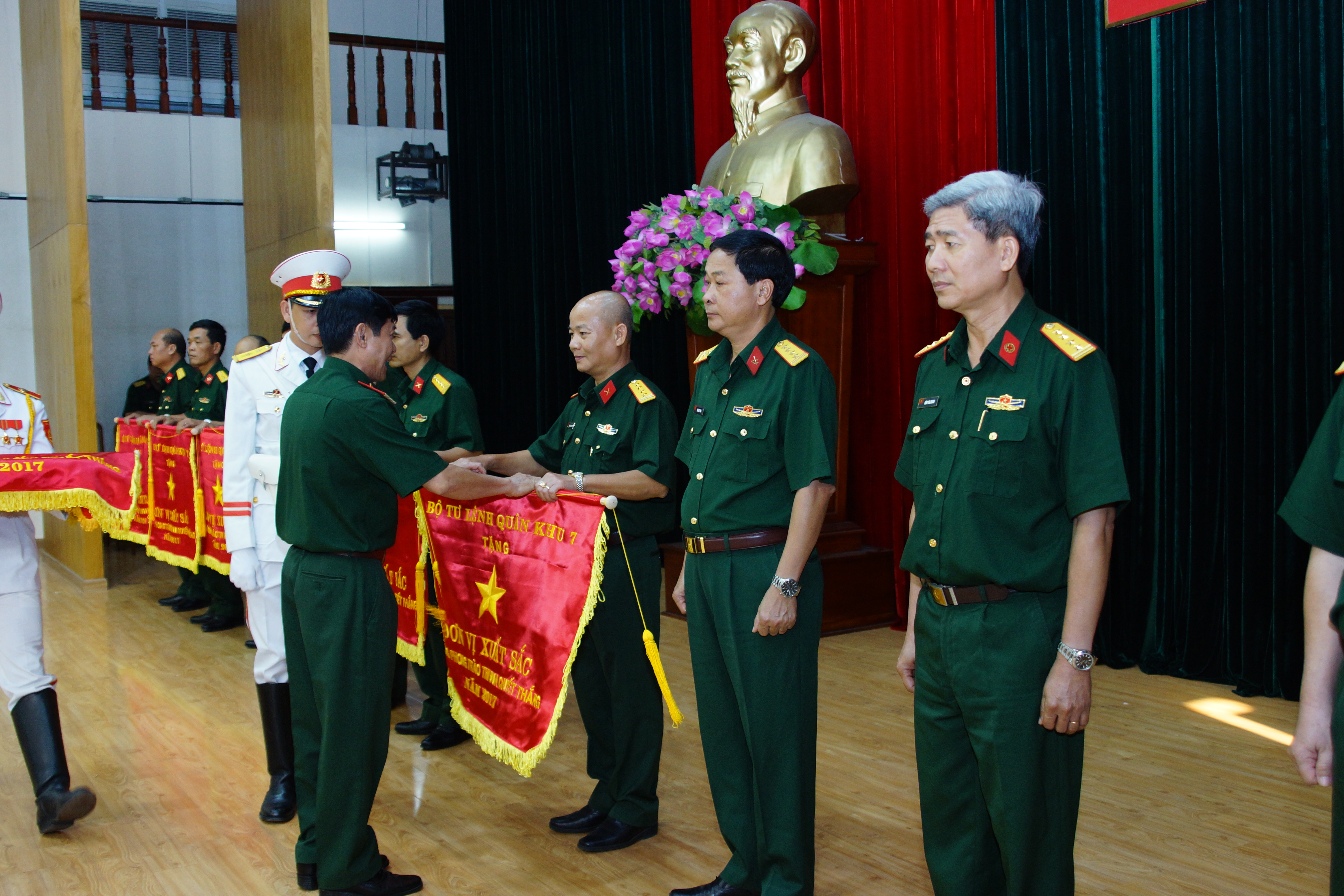 Thiếu tướng Lê Bửu Tuấn, Phó Tư lệnh Tham mưu trưởng Quân khu 7 tặng cờ thi đua cho Phòng Cán Bộ
