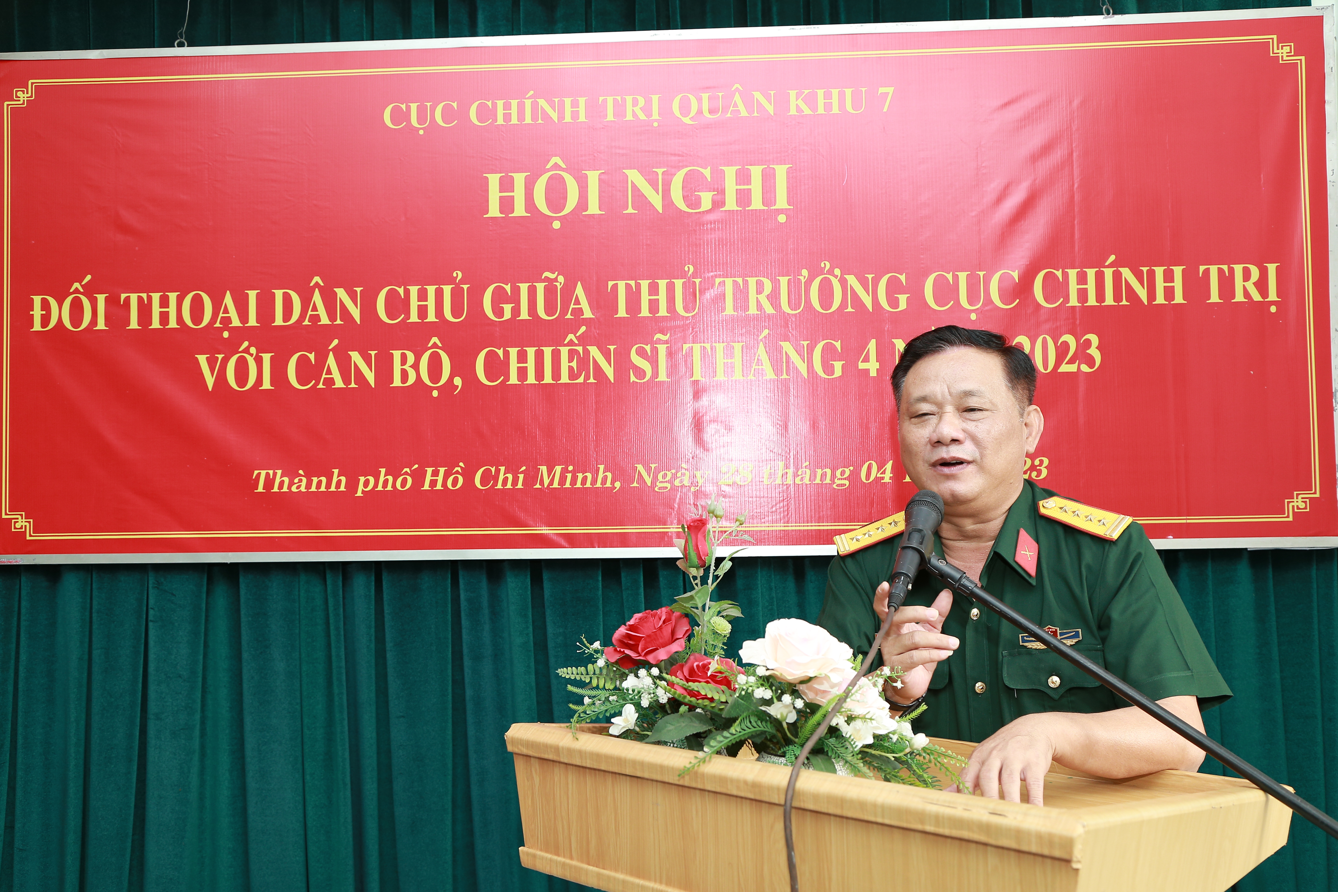 (QK7 Online) – Sáng 28/4, đoàn công tác Cục Chính trị Quân khu 7 do Đại tá Trần Chí Tâm, Bí thư Đảng ủy Cục Chính trị, Phó Chủ nhiệm Chính trị Quân khu làm trưởng đoàn đối thoại dân chủ với cán bộ, chiến sĩ Đoàn Văn công Quân khu tháng 4 năm 2023.
