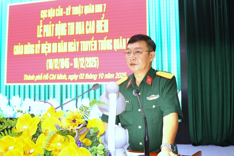 (QK7 Online) - Sáng 2/10, Cục Hậu cần - Kỹ thuật Quân khu tổ chức lễ phát động đợt thi đua cao điểm với chủ đề “80 ngày đêm hành động kiểu mẫu” chào mừng kỷ niệm 80 năm Ngày truyền thống Quân khu 7 (10/12/1945 - 10/12/2025). Đại tá Trần Văn Long, Phó Chính ủy Cục Hậu cần - Kỹ thuật Quân khu dự và phát biểu phát động đợt thi đua cao điểm.