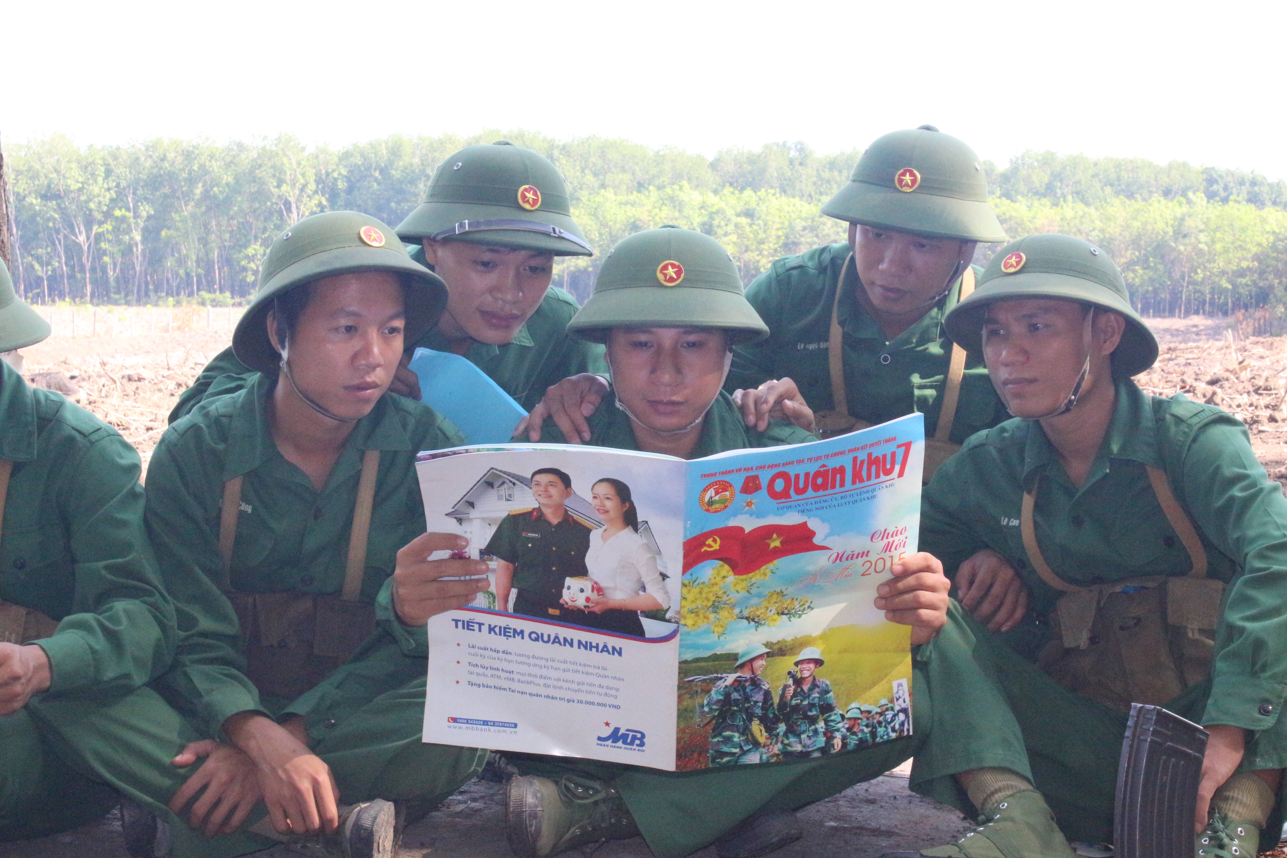 Chiến sĩ Đại đội 31, Ban CHQS huyện Lộc Ninh đọc báo trong giờ nghỉ.