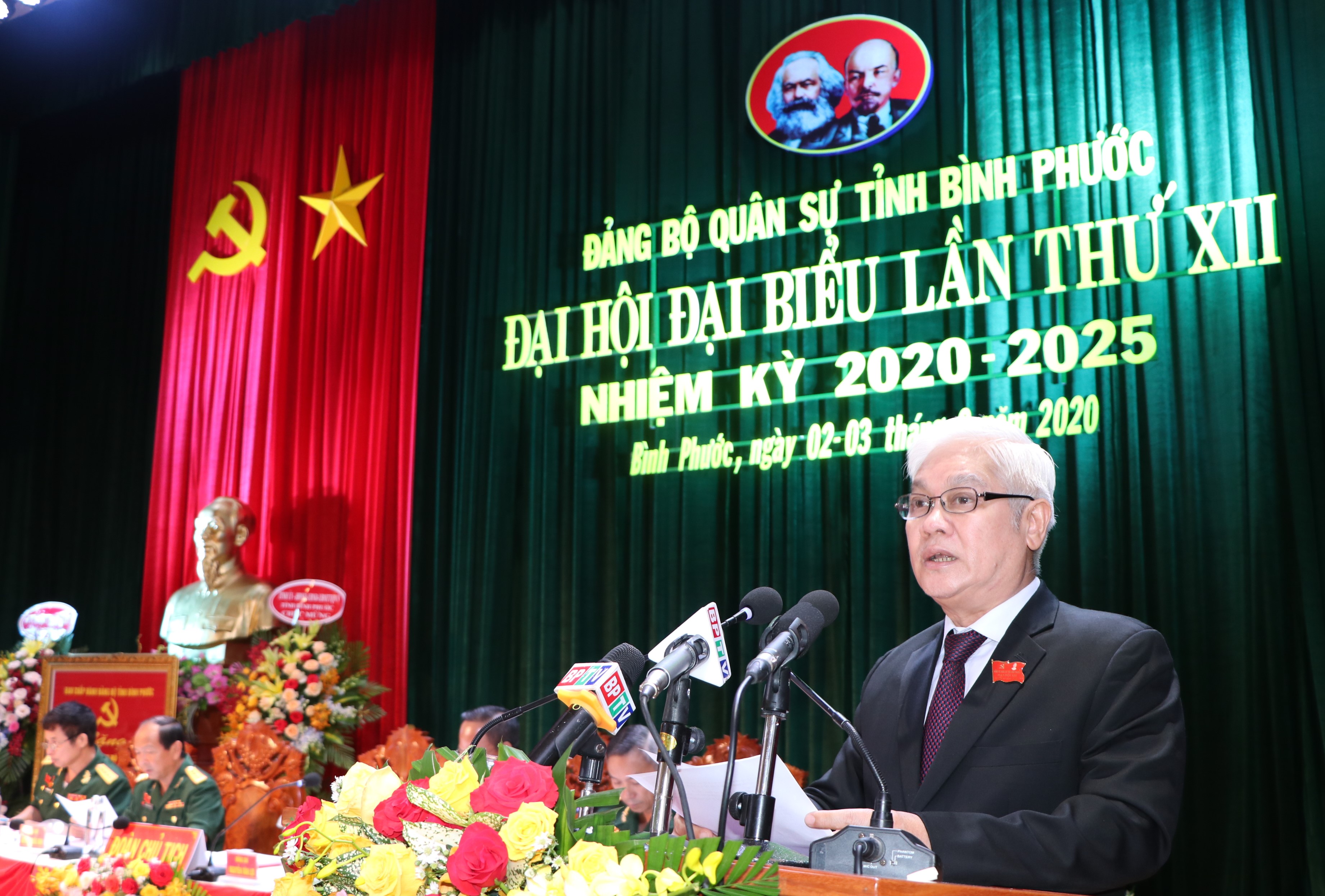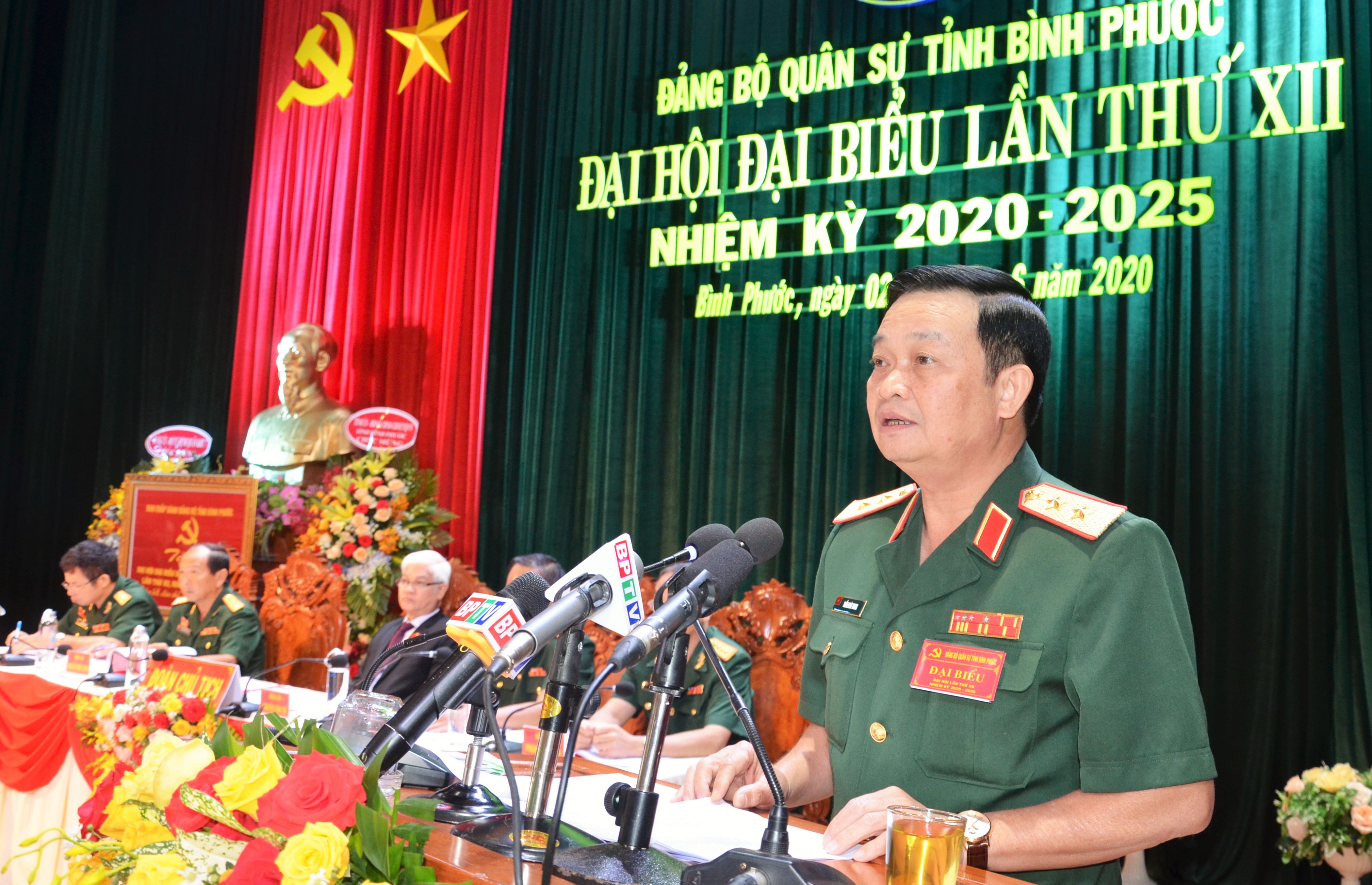 Phát biểu chỉ đạo tại Đại hội, Trung tướng Trần Hoài Trung, Bí thư Đảng ủy, Chính ủy Quân khu biểu dương những thành tích, kết quả Đảng bộ Quân sự tỉnh Bình Phước đạt được trong nhiệm kỳ qua. Trước yêu cầu nhiệm vụ trong tình hình mới, đồng chí đề nghị trong thời gian tới, Đảng bộ quân sự tỉnh Bình Phước cần tiếp tục quán triệt sâu sắc và triển khai thực hiện thắng lợi đường lối, quan điểm, chủ trương, tư tưởng, phương châm chỉ đạo của Đảng, chính sách, pháp luật của Nhà nước về nhiệm vụ quân sự, quốc phòng, bảo vệ Tổ quốc; xây dựng Đảng bộ quân sự vững mạnh về chính trị, tư tưởng, tổ chức và đạo đức, nâng cao năng lực lãnh đạo toàn diện của cấp ủy, tổ chức đảng các cấp, quyết tâm thực hiện thắng lợi các chỉ tiêu nghị quyết Đại hội; giữ vững nguyên tắc tập trung dân chủ, đề cao tự phê bình và phê bình, giữ gìn sự đoàn kết thống nhất trong Đảng bộ và LLVT.