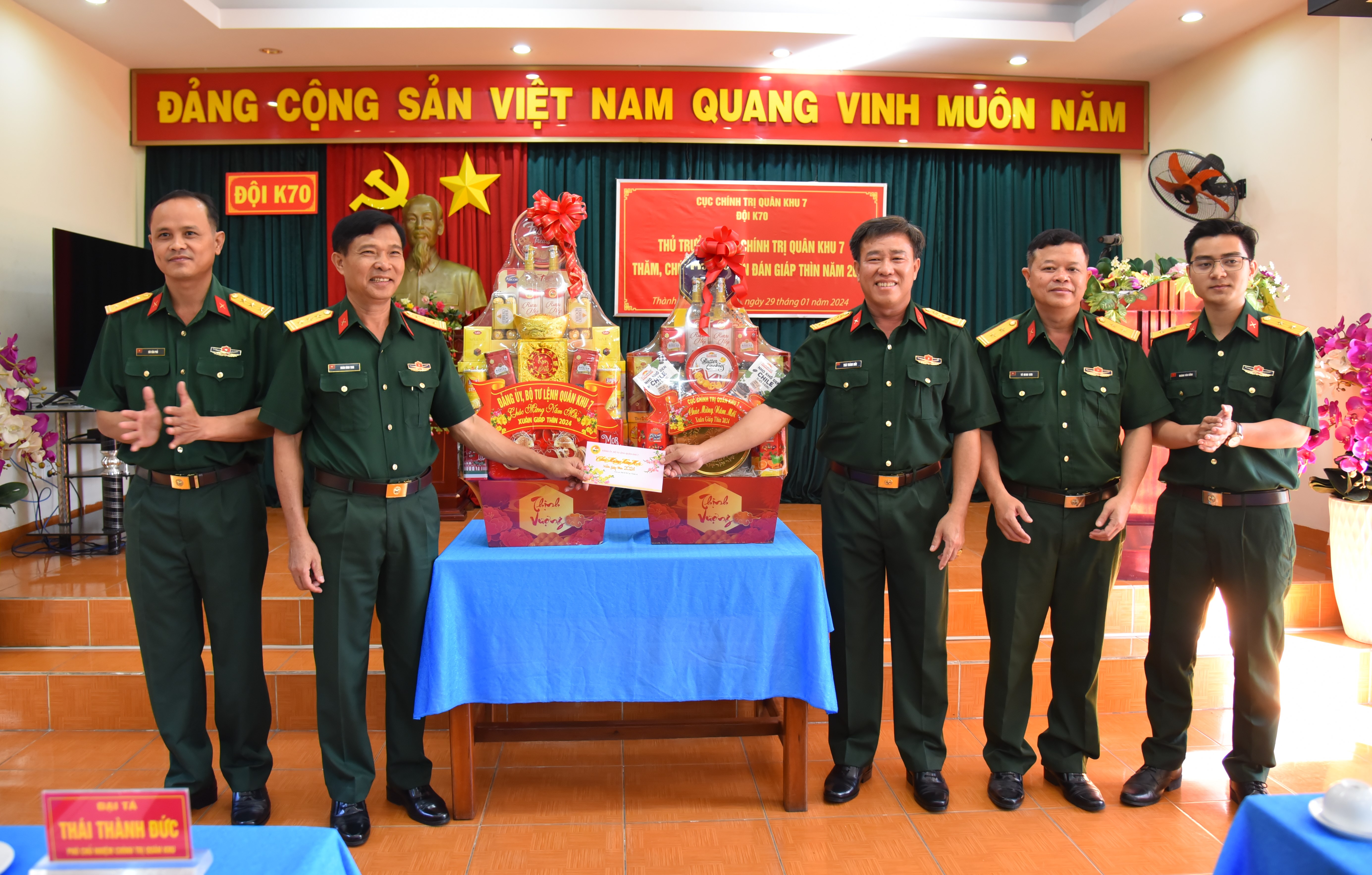 Đại tá Thái Thành Đức cùng đoàn công tác tặng quà chúc mừng năm mới Đội K70.