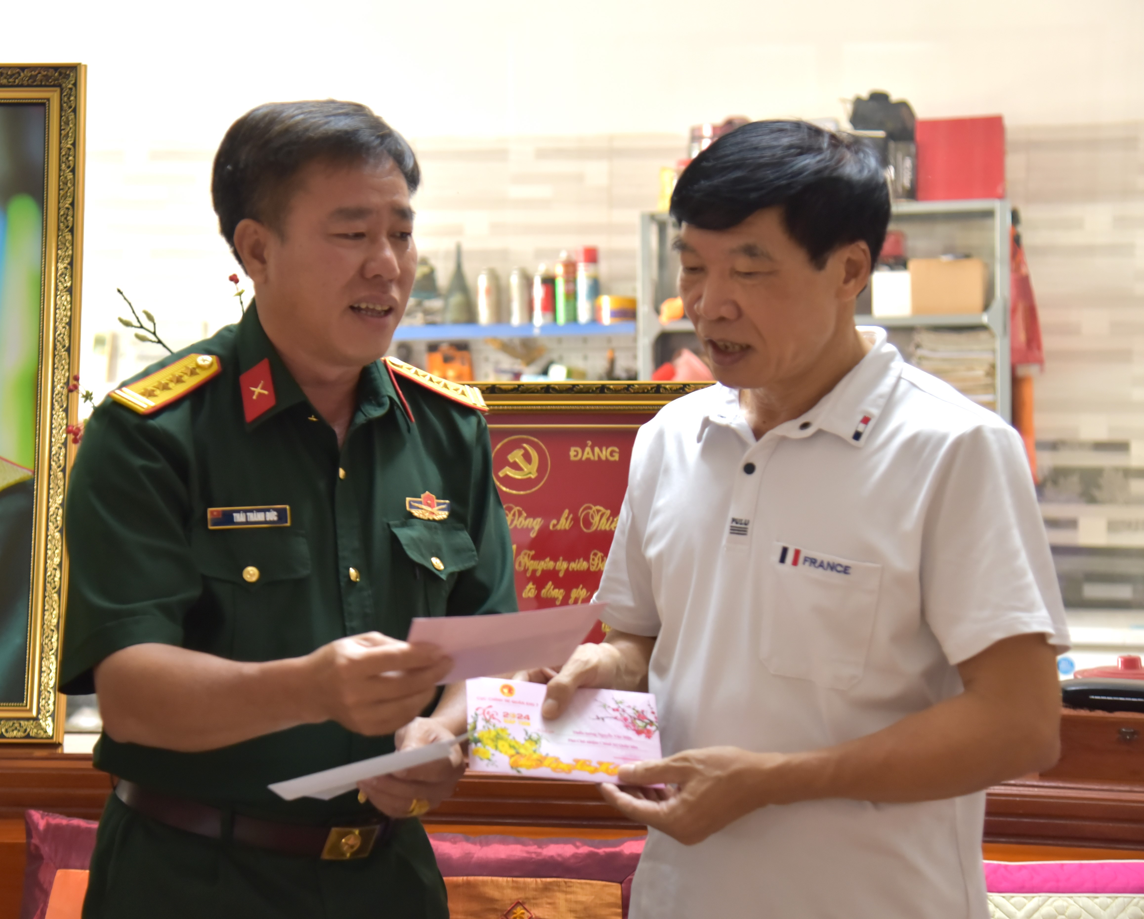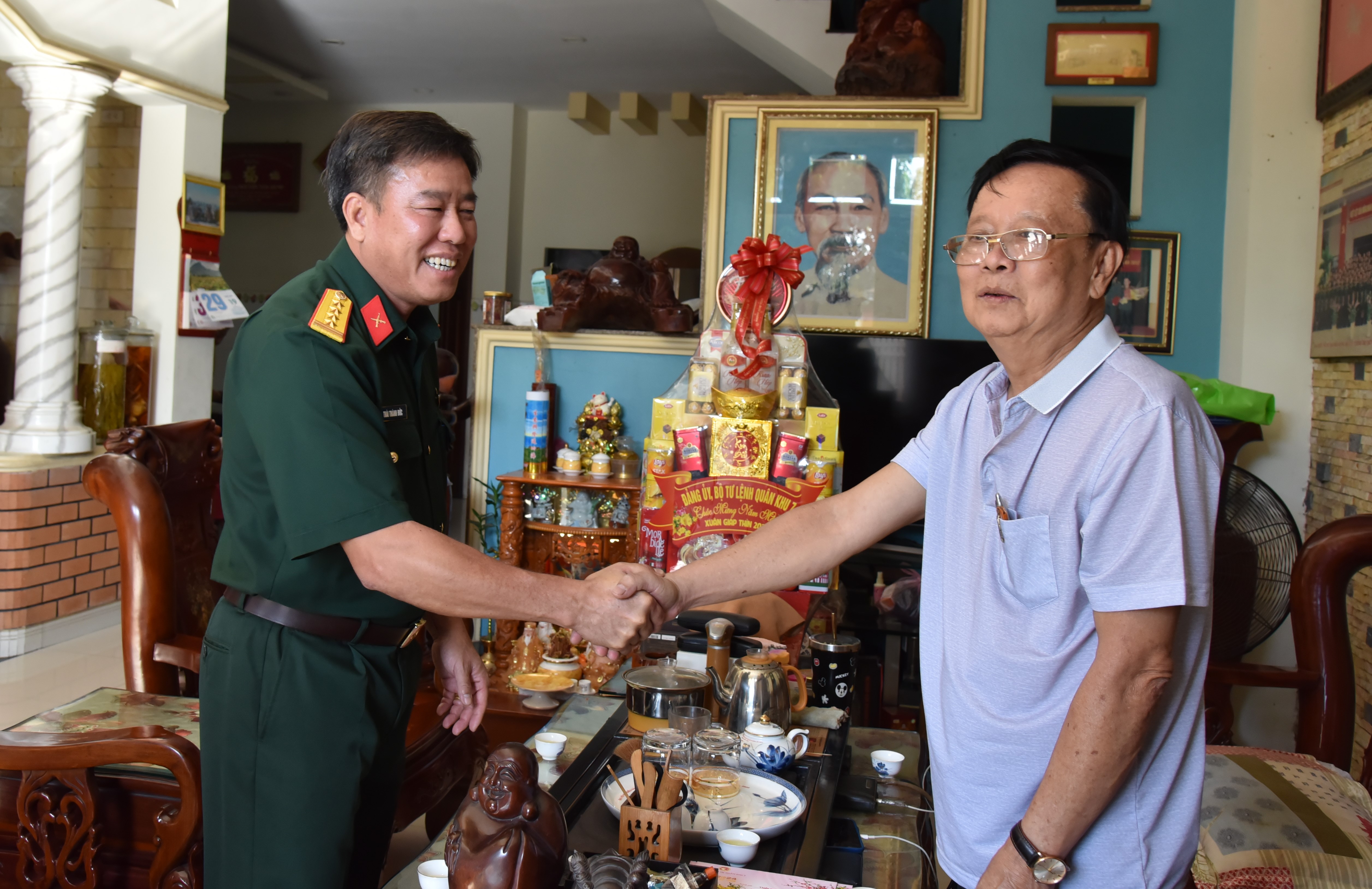 Đại tá Thái Thành Đức chúc Tết gia đình Thiếu tướng Nguyễn Văn Hưng, nguyên Phó Chủ nhiệm Chính trị Quân khu;