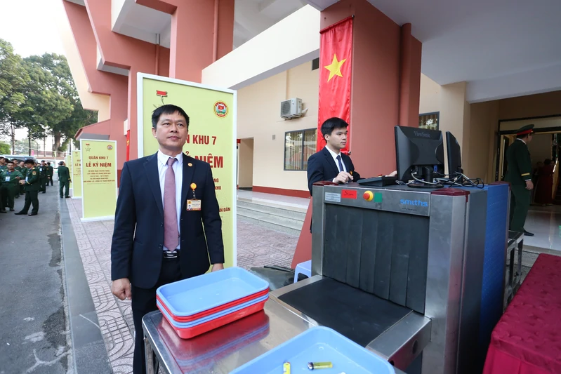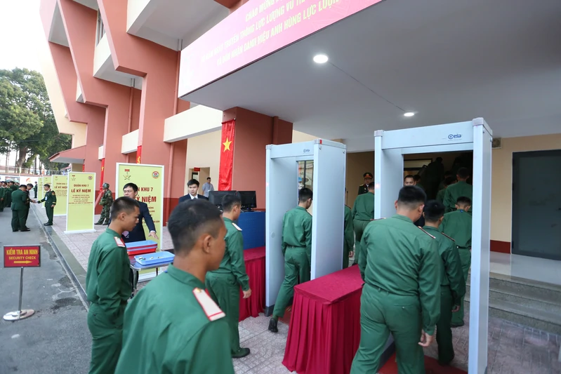 Cán bộ, chiến sĩ qua cửa kiểm tra an ninh vào dự lễ.