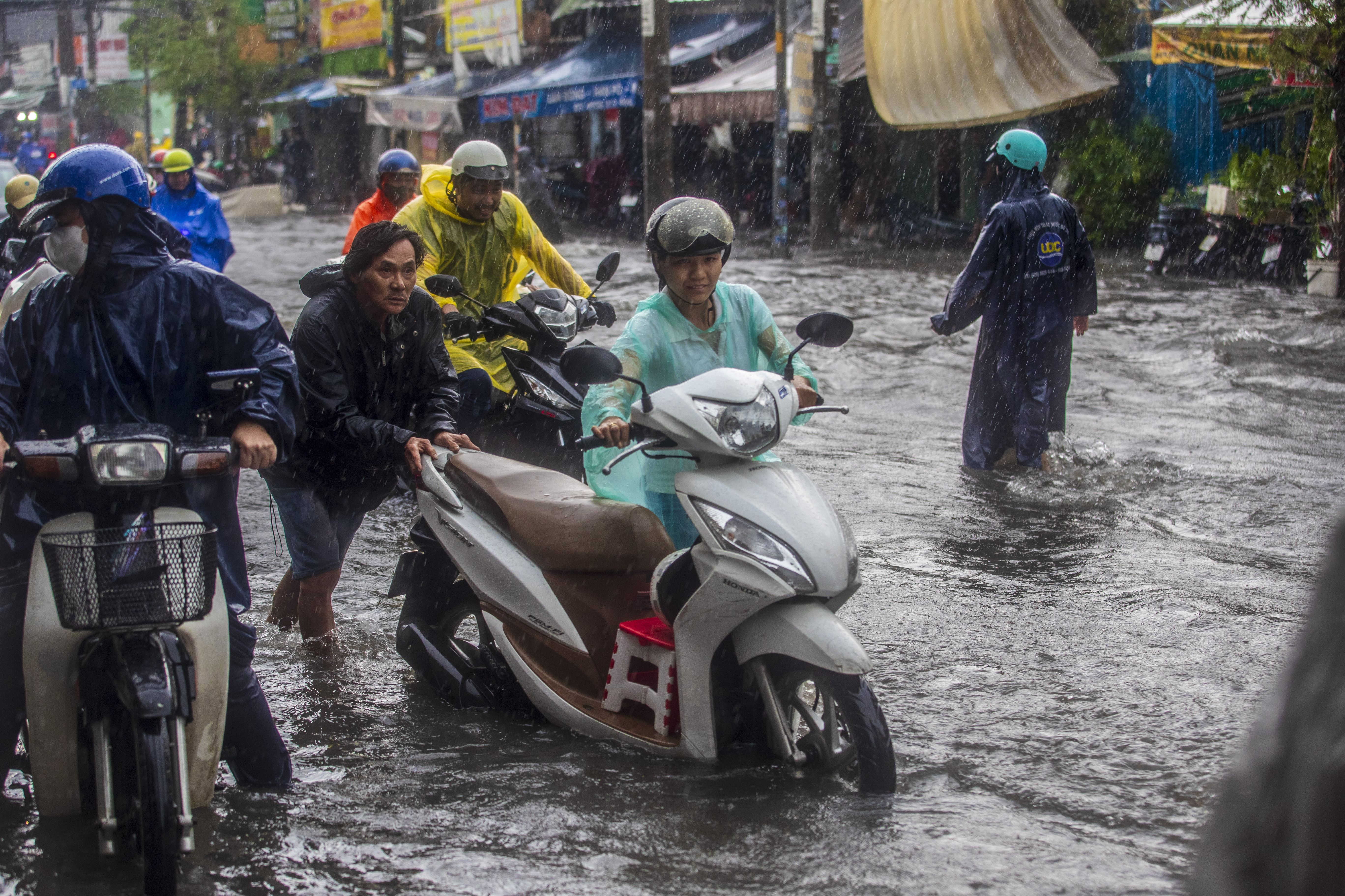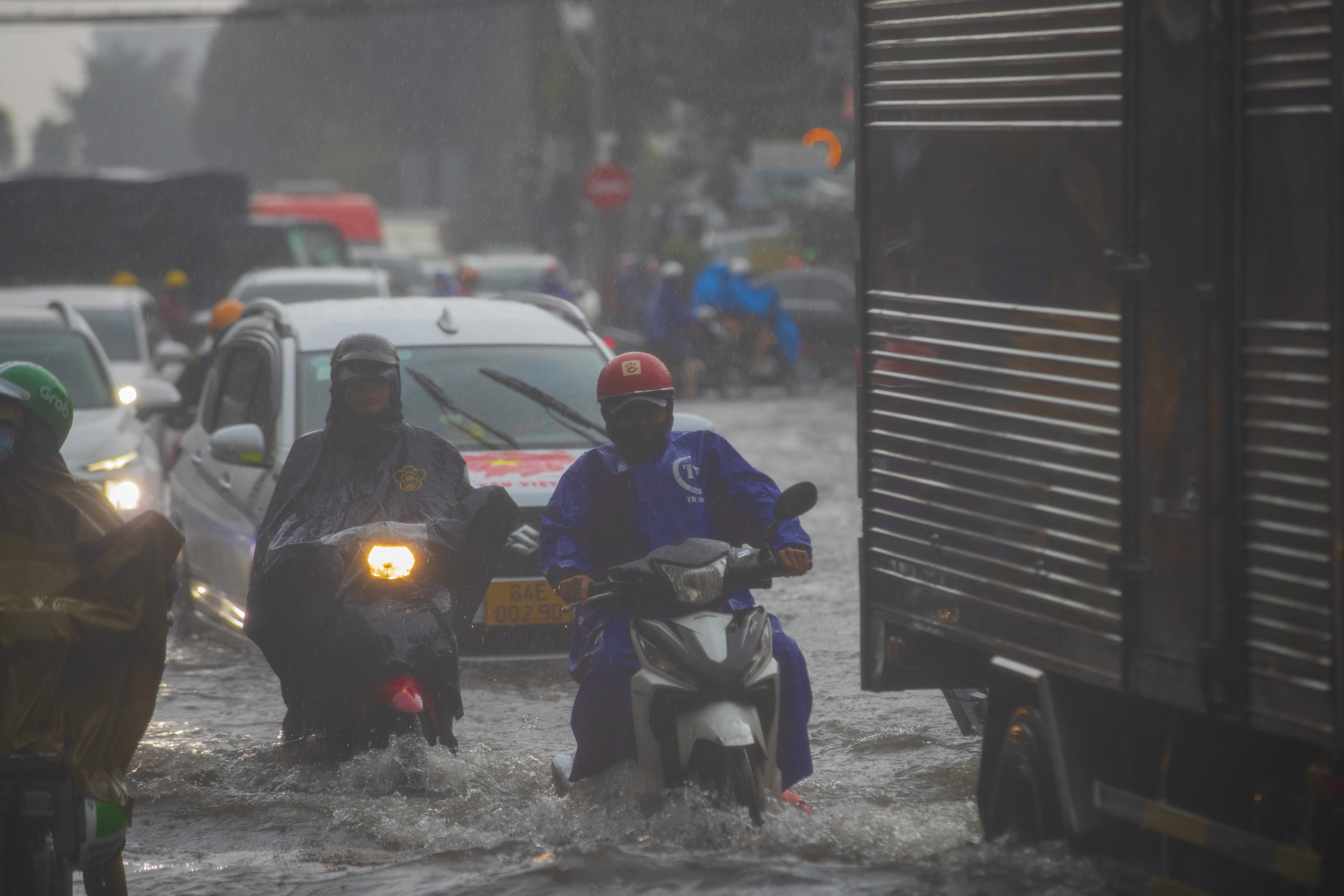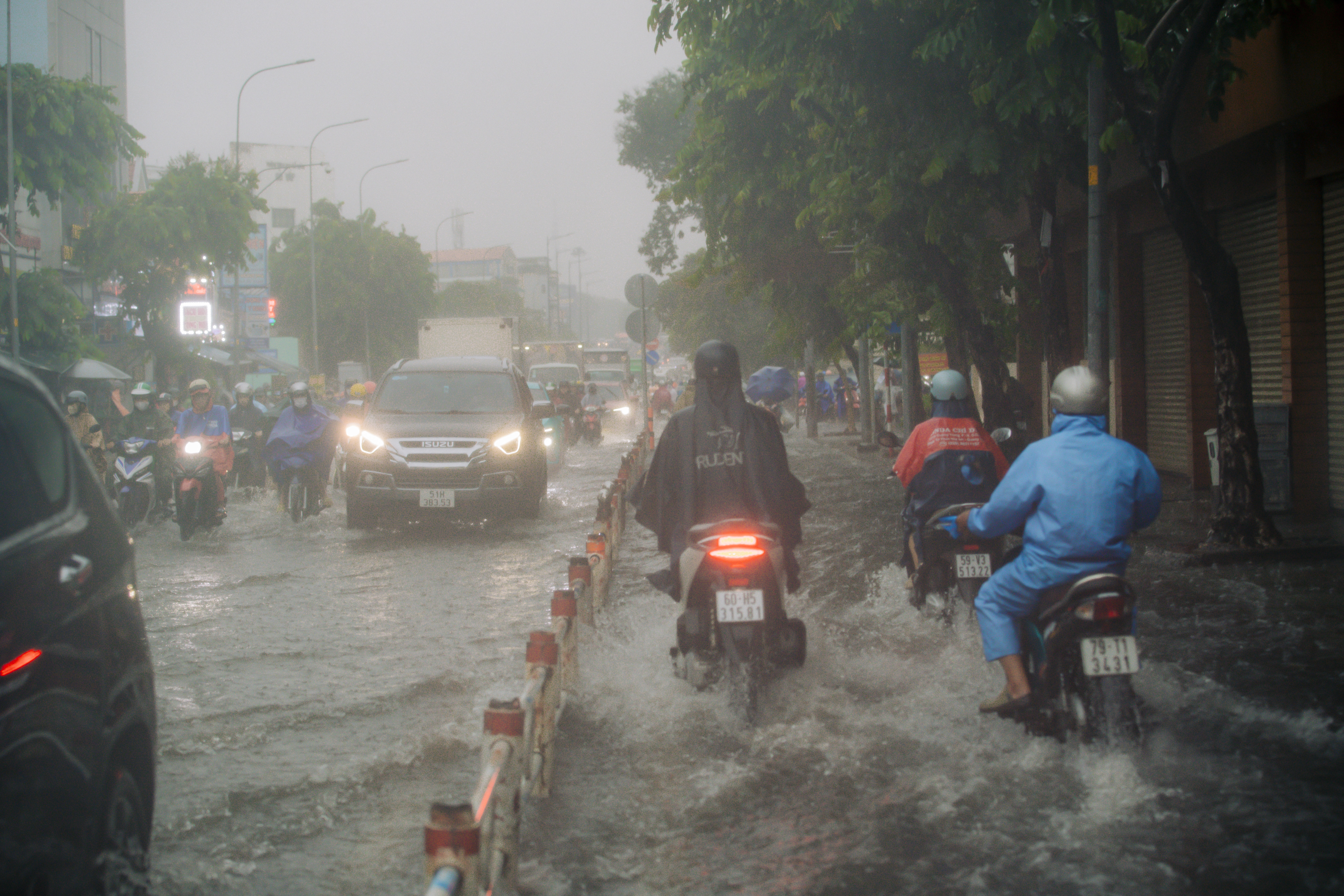 Ghi nhận của phóng viên tại đường Đinh Bộ Lĩnh (phường 26, quận Bình Thạnh), nước dâng nhanh chỉ sau 30 phút, có nơi ngập sâu đến đầu gối. Người dân khổ sở dẫn bộ xe máy chết máy, nhiều người phải nhờ sự giúp đỡ của người dân quanh khu vực để đẩy xe qua những đoạn đường ngập. Không chỉ giao thông bị tê liệt, nhiều con hẻm còn bị nước cuốn theo rác thải, gây tắc nghẽn cống thoát nước và làm tình trạng ngập càng nghiêm trọng hơn.